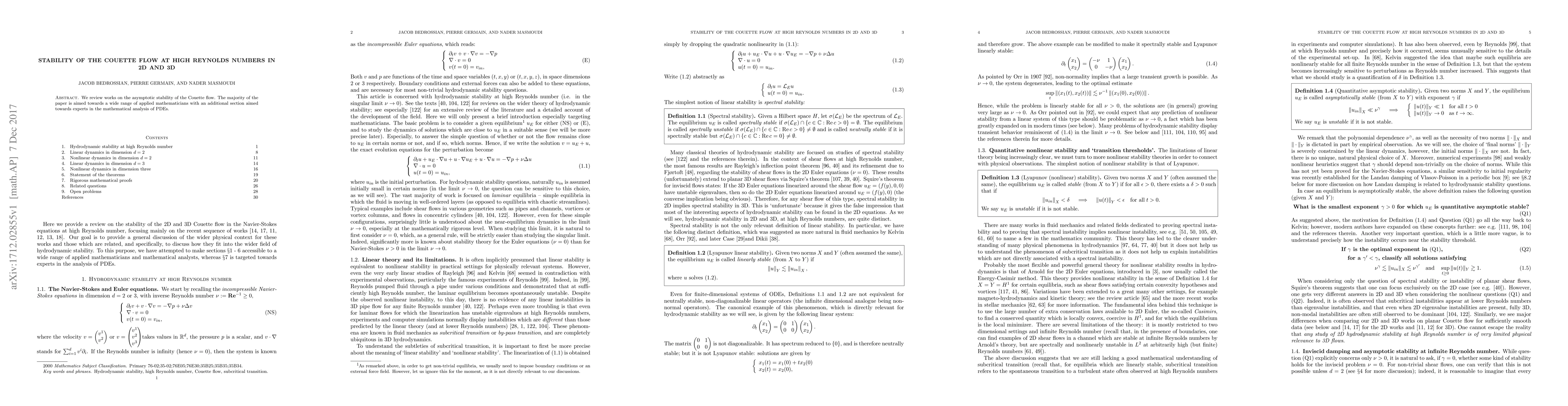 We review works on the asymptotic stability of the Couette flow. The majority of the paper is aimed towards a wide range of applied mathematicians with an additional section aimed towards experts in the mathematical analysis of PDEs.