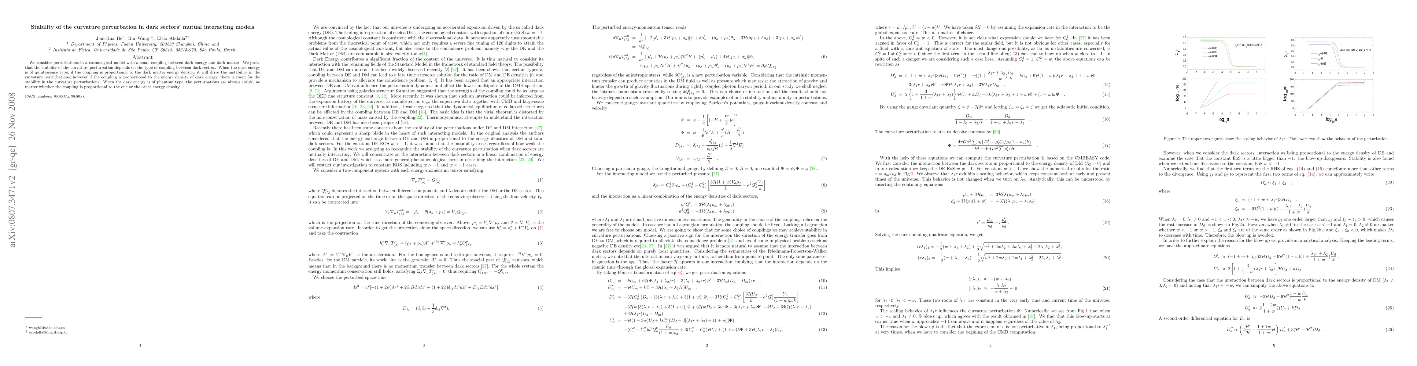 This paper examines perturbations in a cosmological model where dark energy and dark matter interact via a small coupling. It finds that the stability of curvature perturbations depends on the coupling type: quintessence coupling to dark matter energy density induces instability, while coupling to dark energy density allows for stability; phantom dark energy remains stable regardless of coupling type.