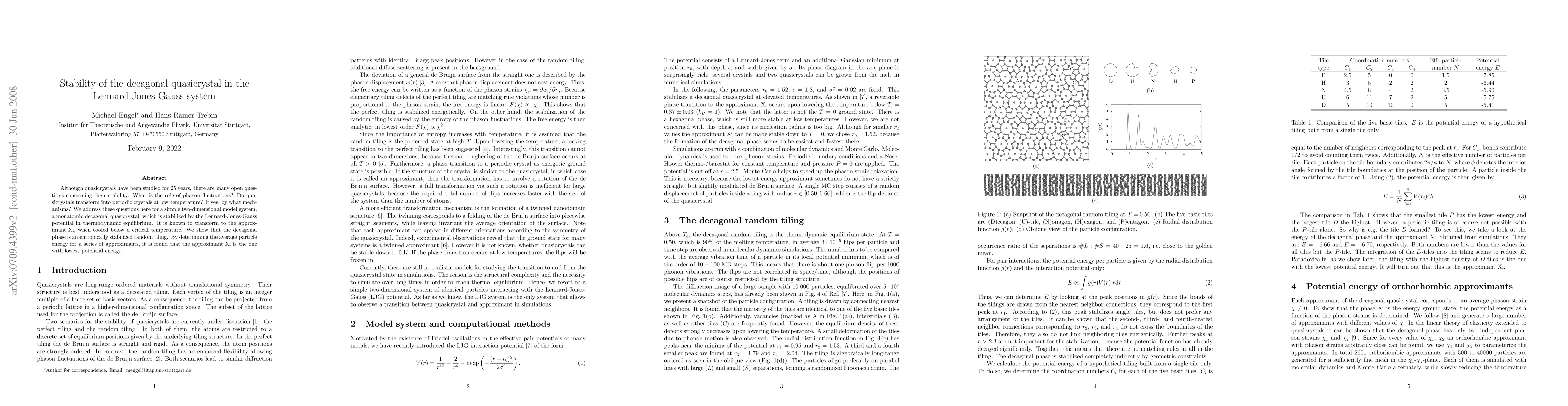 Although quasicrystals have been studied for 25 years, there are many open questions concerning their stability: What is the role of phason fluctuations? Do quasicrystals transform into periodic crystals at low temperature? If yes, by what mechanisms? We address these questions here for a simple two-dimensional model system, a monatomic decagonal quasicrystal, which is stabilized by the Lennard-Jones-Gauss potential in thermodynamic equilibrium. It is known to transform to the approximant Xi, when cooled below a critical temperature. We show that the decagonal phase is an entropically stabilized random tiling. By determining the average particle energy for a series of approximants, it is found that the approximant Xi is the one with lowest potential energy.