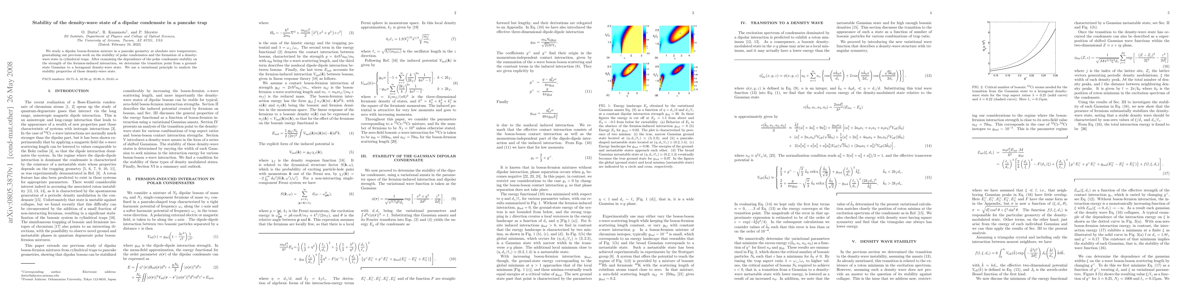 We study a dipolar boson-fermion mixture in a pancake geometry at absolute zero temperature, generalizing our previous work on the stability of polar condensates and the formation of a density-wave state in cylindrical traps. After examining the dependence of the polar condensate stability on the strength of the fermion-induced interaction, we determine the transition point from a ground-state Gaussian to a hexagonal density-wave state. We use a variational principle to analyze the stability properties of those density-wave state.