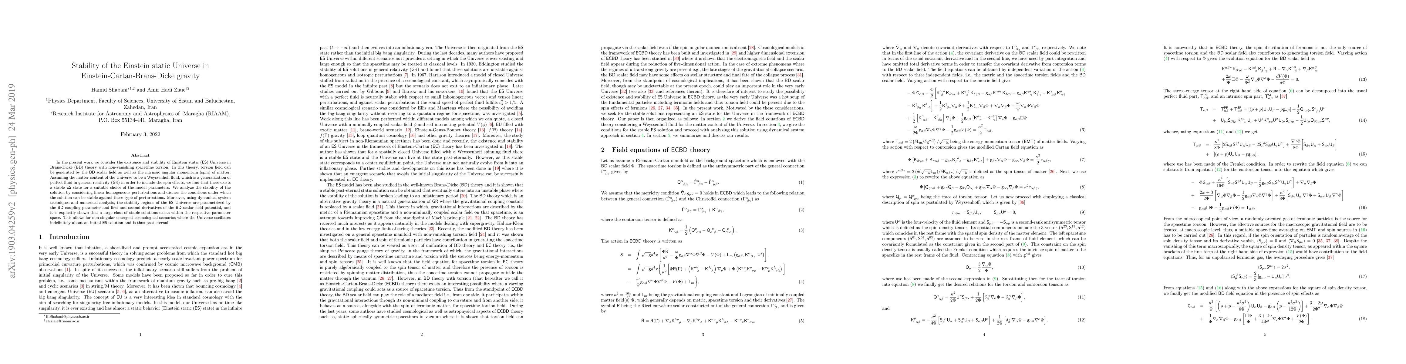 In the present work we consider the existence and stability of Einstein static {\sf ES} Universe in Brans-Dicke ({\sf BD}) theory with non-vanishing spacetime torsion. In this theory, torsion field can be generated by the {\sf BD} scalar field as well as the intrinsic angular momentum (spin) of matter. Assuming the matter content of the Universe to be a Weyssenhoff fluid, which is a generalization of perfect fluid in general relativity ({\sf GR}) in order to include the spin effects, we find that there exists a stable {\sf ES} state for a suitable choice of the model parameters. We analyze the stability of the solution by considering linear homogeneous perturbations and discuss the conditions under which the solution can be stable against these type of perturbations. Moreover, using dynamical system techniques and numerical analysis, the stability regions of the {\sf ES} Universe are parametrized by the {\sf BD} coupling parameter and first and second derivatives of the {\sf BD} scalar field potential, and it is explicitly shown that a large class of stable solutions exists within the respective parameter space. This allows for non-singular emergent cosmological scenarios where the Universe oscillates indefinitely about an initial {\sf ES} solution and is thus past eternal.