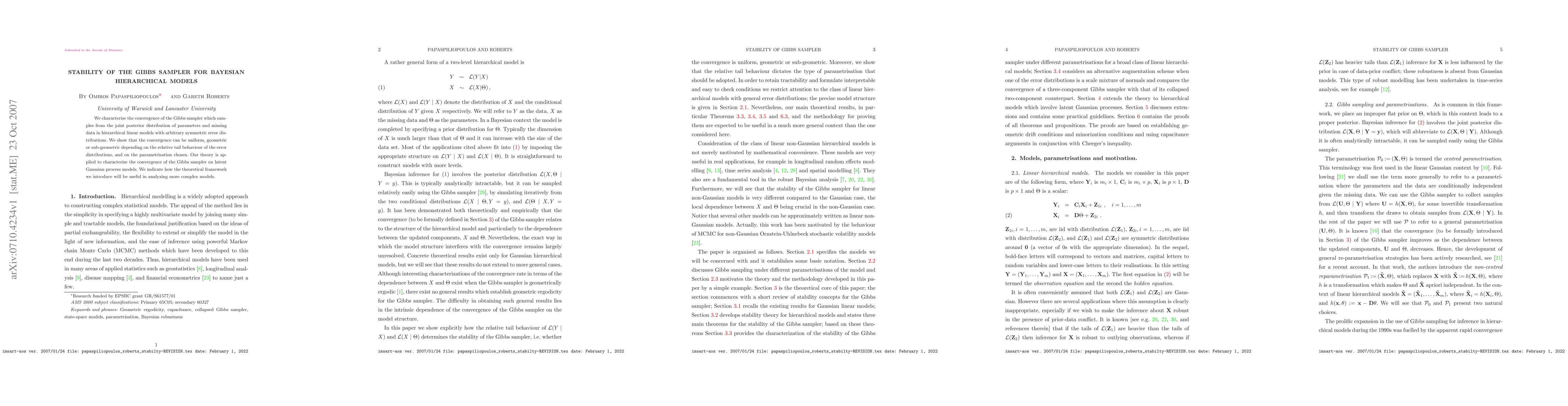 This paper investigates the convergence properties of the Gibbs sampler in Bayesian hierarchical models, demonstrating that its convergence can be uniform, geometric, or sub-geometric based on the error distribution's tail behaviour and chosen parametrisation. The findings are applied to latent Gaussian process models and suggest broader applicability for complex model analysis.