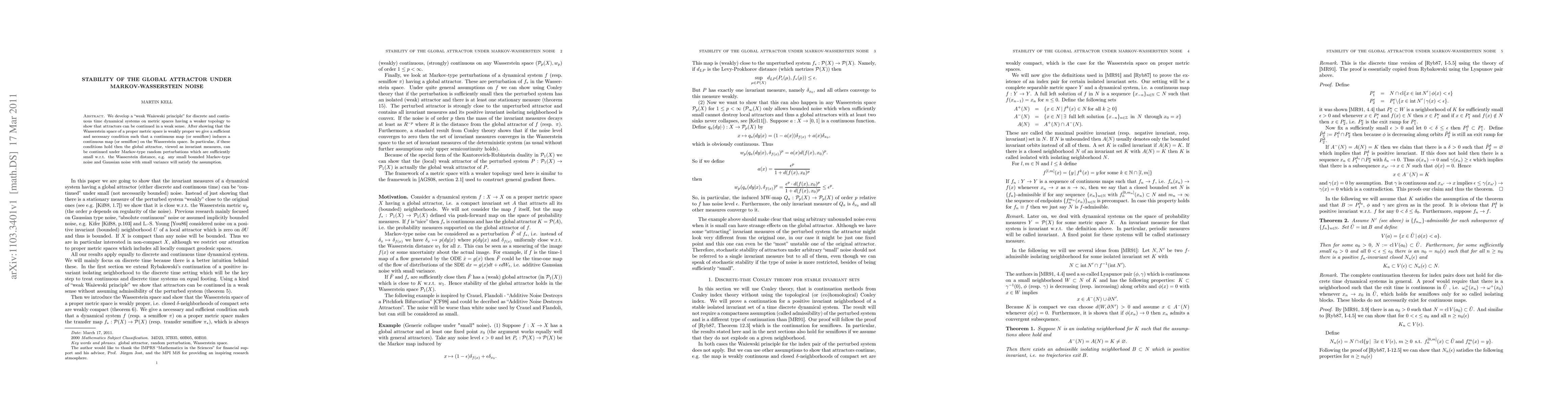 The paper establishes a "weak Waźewski principle" to demonstrate the continuation of attractors under Markov-Wasserstein noise. It provides a necessary and sufficient condition for continuous maps to induce similar behavior in the Wasserstein space, ensuring the stability of global attractors under small Markov-type perturbations.
