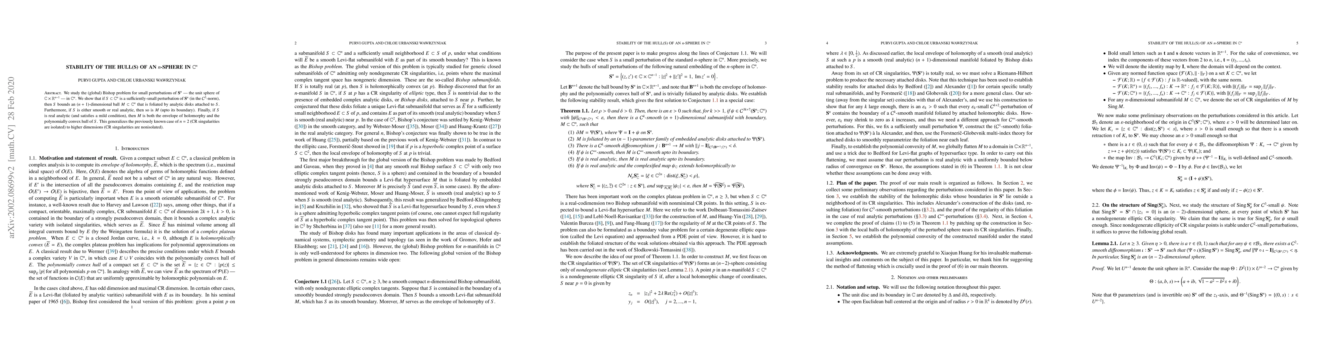 We study the (global) Bishop problem for small perturbations of $\mathbf{S}^n$ --- the unit sphere of $\mathbb{C}\times\mathbb{R}^{n-1}$ --- in $\mathbb{C}^n$. We show that if $S\subset\mathbb{C}^n$ is a sufficiently-small perturbation of $\mathbf{S}^n$ (in the $\mathcal{C}^3$-norm), then $S$ bounds an $(n+1)$-dimensional ball $M\subset\mathbb{C}^n$ that is foliated by analytic disks attached to $S$. Furthermore, if $S$ is either smooth or real analytic, then so is $M$ (upto its boundary). Finally, if $S$ is real analytic (and satisfies a mild condition), then $M$ is both the envelope of holomorphy and the polynomially convex hull of $S$. This generalizes the previously known case of $n=2$ (CR singularities are isolated) to higher dimensions (CR singularities are nonisolated).