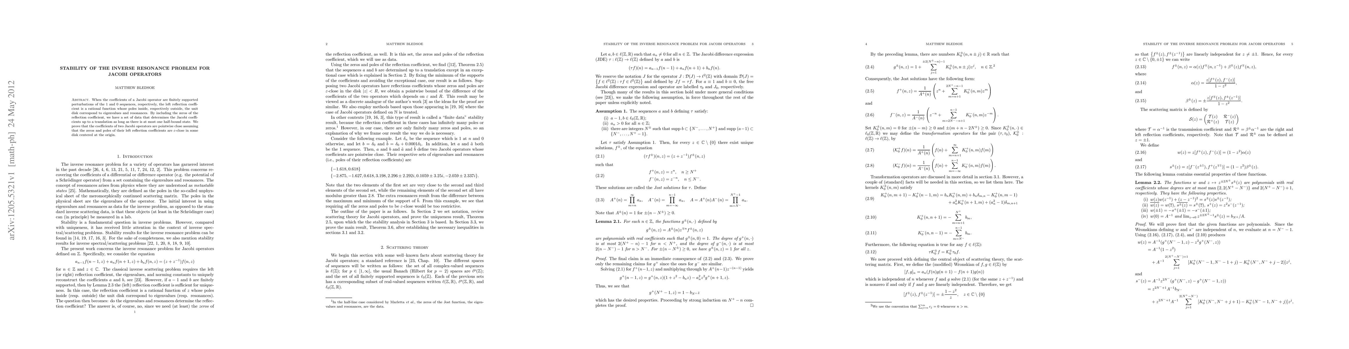 When the coefficients of a Jacobi operator are finitely supported perturbations of the 1 and 0 sequences, respectively, the left reflection coefficient is a rational function whose poles inside, respectively outside, the unit disk correspond to eigenvalues and resonances. By including the zeros of the reflection coefficient, we have a set of data that determines the Jacobi coefficients up to a translation as long as there is at most one half-bound state. We prove that the coefficients of two Jacobi operators are pointwise close assuming that the zeros and poles of their left reflection coefficients are $\eps$-close in some disk centered at the origin.