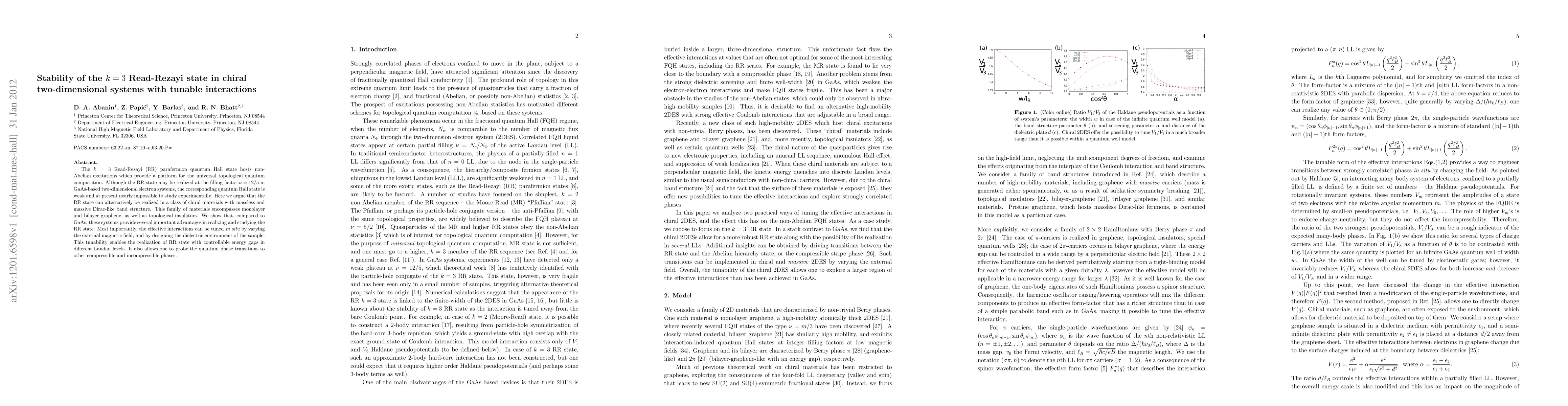 This paper explores the stability of the k=3 Read-Rezayi quantum Hall state in chiral two-dimensional materials, demonstrating that it can be realized in systems like graphene and topological insulators. The tunability of interactions in these materials allows for controllable energy gaps and the study of quantum phase transitions.