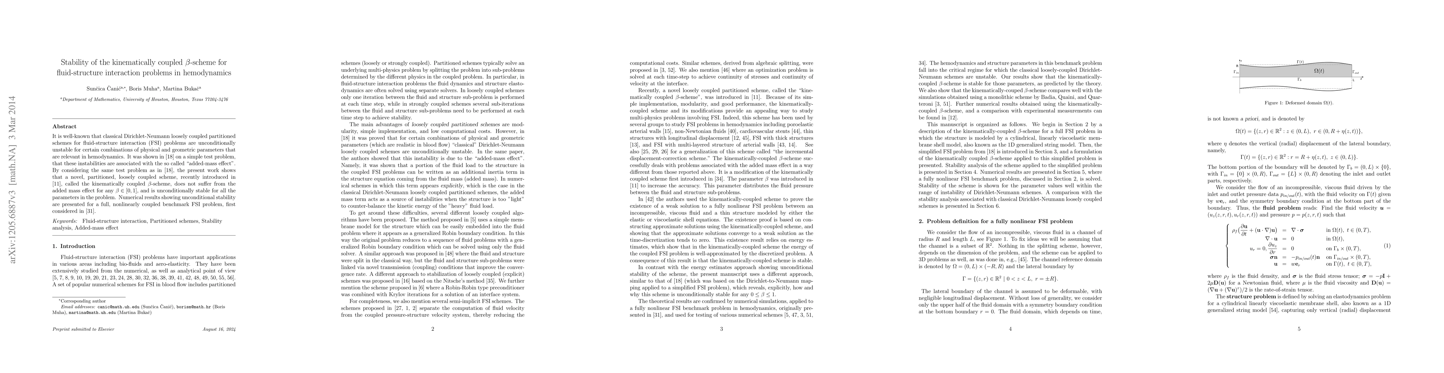 This paper investigates the stability of a novel kinematically coupled β-scheme for fluid-structure interaction problems in hemodynamics, demonstrating its unconditional stability for all relevant parameters, unlike classical partitioned schemes. Numerical results confirm the scheme's stability against the added-mass effect for any β in the range [0,1].