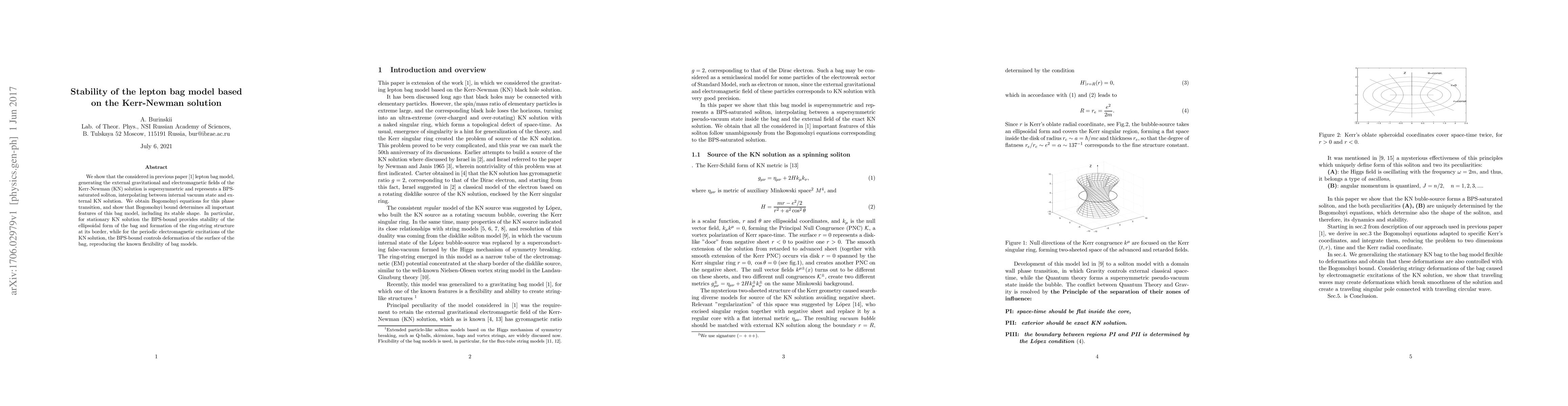 We show that the considered in previous paper \cite{BurGrBag} lepton bag model, generating the external gravitational and electromagnetic fields of the Kerr-Newman (KN) solution is supersymmetric and represents a BPS-saturated soliton, interpolating between internal vacuum state and external KN solution. We obtain Bogomolnyi equations for this phase transition, and show that Bogomolnyi bound determines all important features of this bag model, including its stable shape. In particular, for stationary KN solution the BPS-bound provides stability of the ellipsoidal form of the bag and formation of the ring-string structure at its border, while for the periodic electromagnetic excitations of the KN solution, the BPS-bound controls deformation of the surface of the bag, reproducing the known flexibility of bag models.