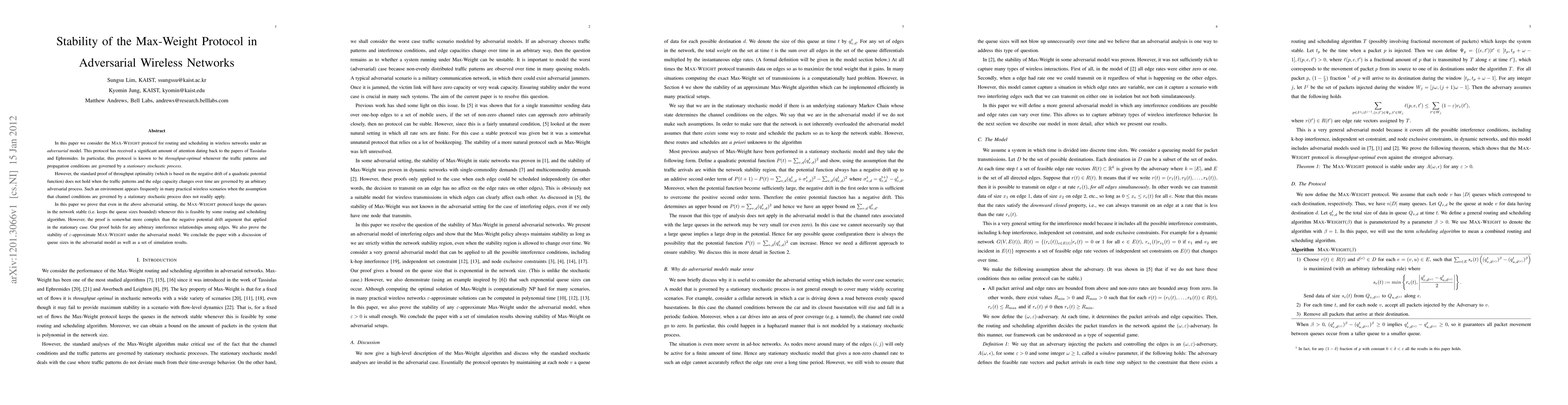 This paper investigates the stability of the Max-Weight protocol in adversarial wireless networks, demonstrating that it maintains queue stability even when traffic patterns and edge capacities are subject to arbitrary adversarial changes. The paper provides a more complex proof compared to the stationary case, ensuring stability under any interference relationships.