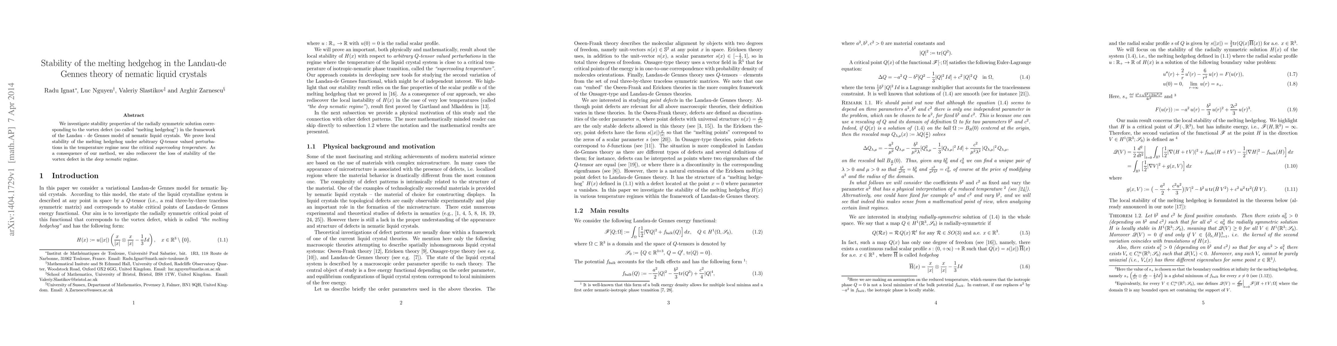 This paper investigates the stability of the "melting hedgehog" vortex defect in nematic liquid crystals, proving its local stability under perturbations near the critical supercooling temperature, while also rediscovering its instability in the deep nematic regime.