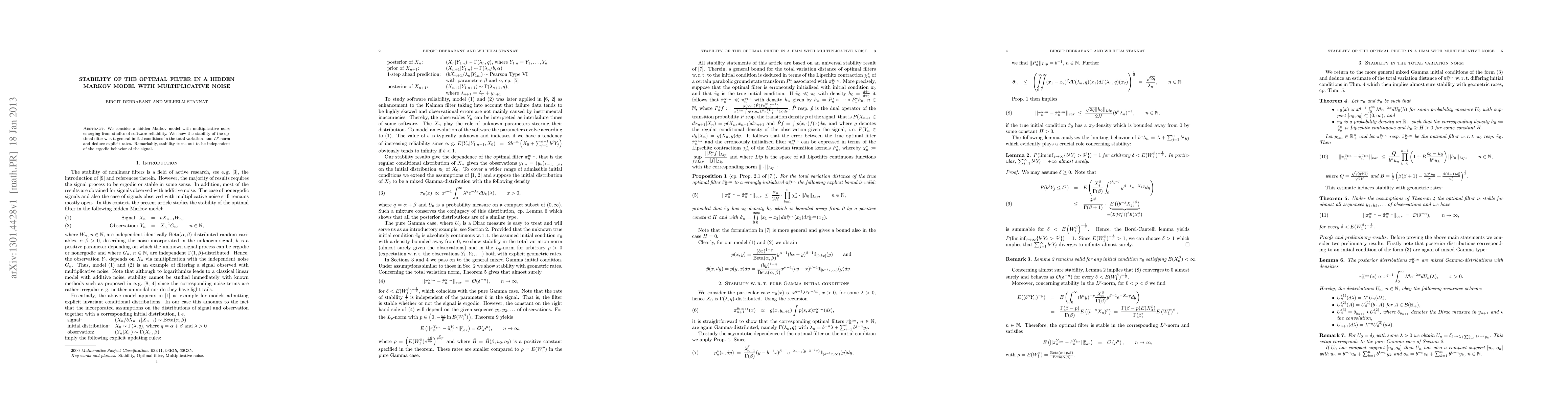 We consider a hidden Markov model with multiplicative noise emerging from studies of software reliability. We show the stability of the optimal filter with respect to general initial conditions in the total variation- and $L^p$-norm and deduce explicit rates. Remarkably, stability turns out to be independent of the ergodic behavior of the signal.