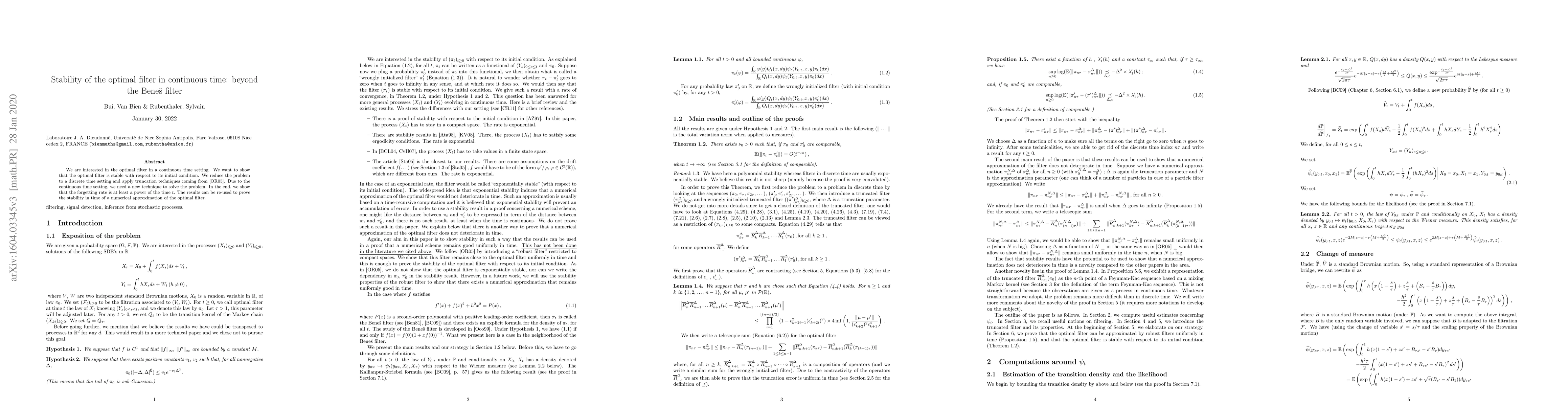 This paper investigates the stability of the optimal filter in continuous time, demonstrating its stability concerning initial conditions. By transitioning to a discrete time framework and employing truncation techniques, the authors develop a novel method to address the continuous time setting, proving that the forgetting rate scales as a power of time.
