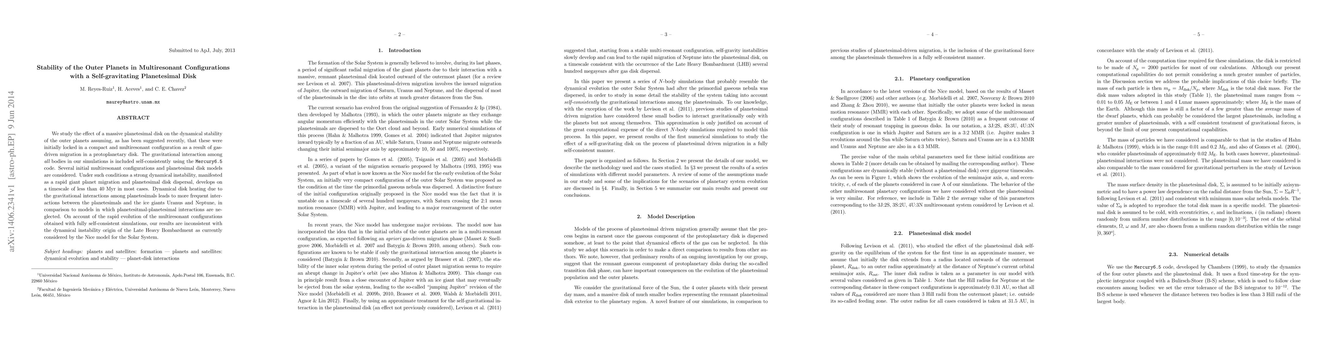 This paper investigates the stability of outer planets in multiresonant configurations influenced by a self-gravitating planetesimal disk, finding rapid dynamical instability and migration within 40 Myr, which contradicts the Late Heavy Bombardment explanation in the Nice model. The study uses self-consistent gravitational interactions from Mercury6.5 simulations.