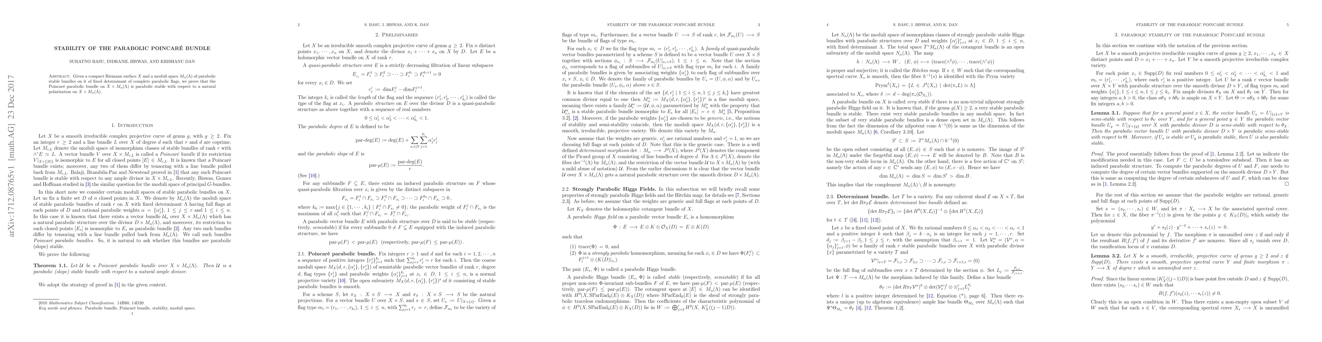 Summary: This paper proves the parabolic stability of the Poincaré bundle associated with a compact Riemann surface and its moduli space of parabolic stable bundles, under a natural polarization on the product space. The result highlights the bundle's stability in a complex parabolic setting.