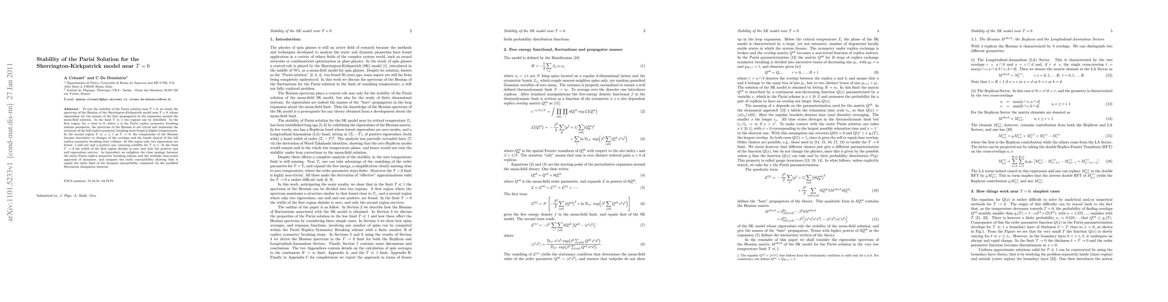 Researchers study the stability of the Parisi solution for the Sherrington-Kirkpatrick model near T=0, finding two regions where the Hessian spectrum exhibits non-trivial structure or simplifies to a stable configuration with only two eigenvalues.