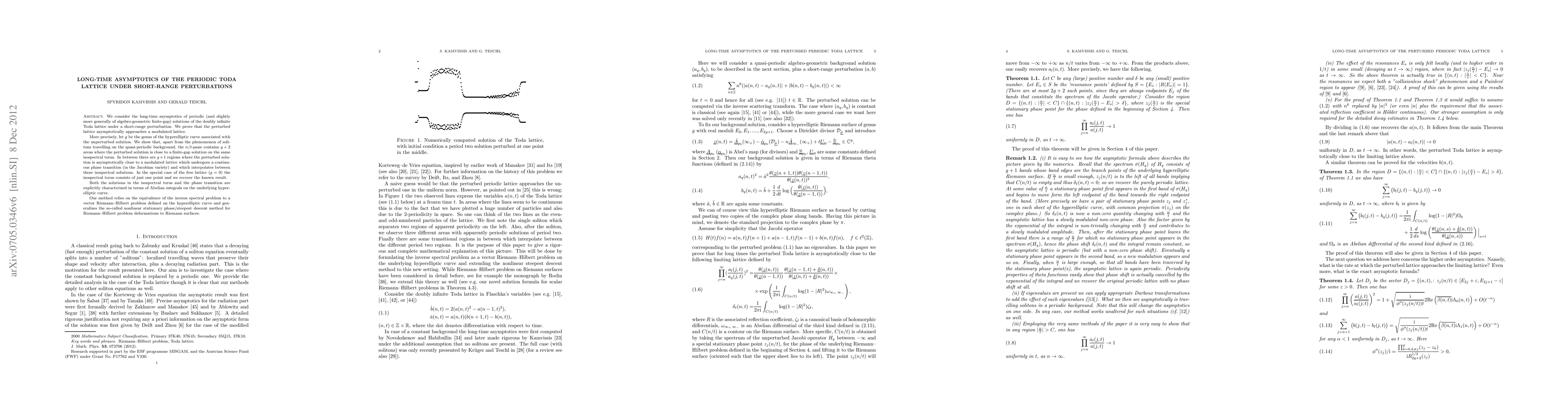 We consider the stability of the periodic Toda lattice (and slightly more generally of the algebro-geometric finite-gap lattice) under a short range perturbation. We prove that the perturbed lattice asymptotically approaches a modulated lattice. More precisely, let $g$ be the genus of the hyperelliptic curve associated with the unperturbed solution. We show that, apart from the phenomenon of the solitons travelling on the quasi-periodic background, the $n/t$-pane contains $g+2$ areas where the perturbed solution is close to a finite-gap solution in the same isospectral torus. In between there are $g+1$ regions where the perturbed solution is asymptotically close to a modulated lattice which undergoes a continuous phase transition (in the Jacobian variety) and which interpolates between these isospectral solutions. In the special case of the free lattice ($g=0$) the isospectral torus consists of just one point and we recover the known result. Both the solutions in the isospectral torus and the phase transition are explicitly characterized in terms of Abelian integrals on the underlying hyperelliptic curve. Our method relies on the equivalence of the inverse spectral problem to a matrix Riemann--Hilbert problem defined on the hyperelliptic curve and generalizes the so-called nonlinear stationary phase/steepest descent method for Riemann--Hilbert problem deformations to Riemann surfaces.