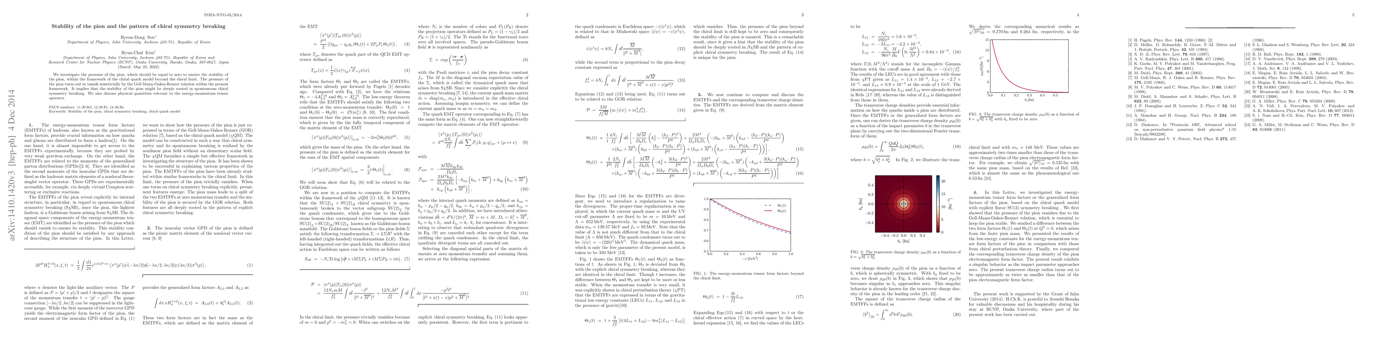 This paper explores the stability of the pion in the chiral quark model, demonstrating that its pressure is zero due to the Gell-Mann-Oakes-Renner relation, suggesting that pion stability is linked to spontaneous chiral symmetry breaking. The study also examines relevant physical quantities associated with the energy-momentum tensor operator.