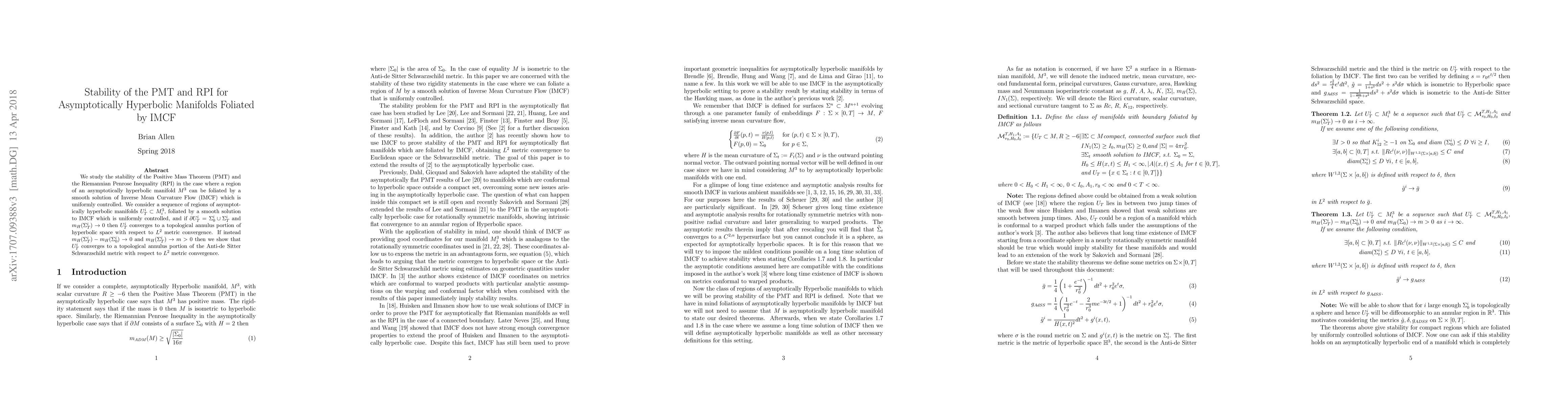We study the stability of the Positive Mass Theorem (PMT) and the Riemannian Penrose Inequality (RPI) in the case where a region of an asymptotically hyperbolic manifold $M^3$ can be foliated by a smooth solution of Inverse Mean Curvature Flow (IMCF) which is uniformly controlled. We consider a sequence of regions of asymptotically hyperbolic manifolds $U_T^i\subset M_i^3$, foliated by a smooth solution to IMCF which is uniformly controlled, and if $\partial U_T^i = \Sigma_0^i \cup \Sigma_T^i$ and $m_H(\Sigma_T^i) \rightarrow 0$ then $U_T^i$ converges to a topological annulus portion of hyperbolic space with respect to $L^2$ metric convergence. If instead $m_H(\Sigma_T^i)-m_H(\Sigma_0^i) \rightarrow 0$ and $m_H(\Sigma_T^i) \rightarrow m >0$ then we show that $U_T^i$ converges to a topological annulus portion of the Anti-deSitter Schwarzschild metric with respect to $L^2$ metric convergence.