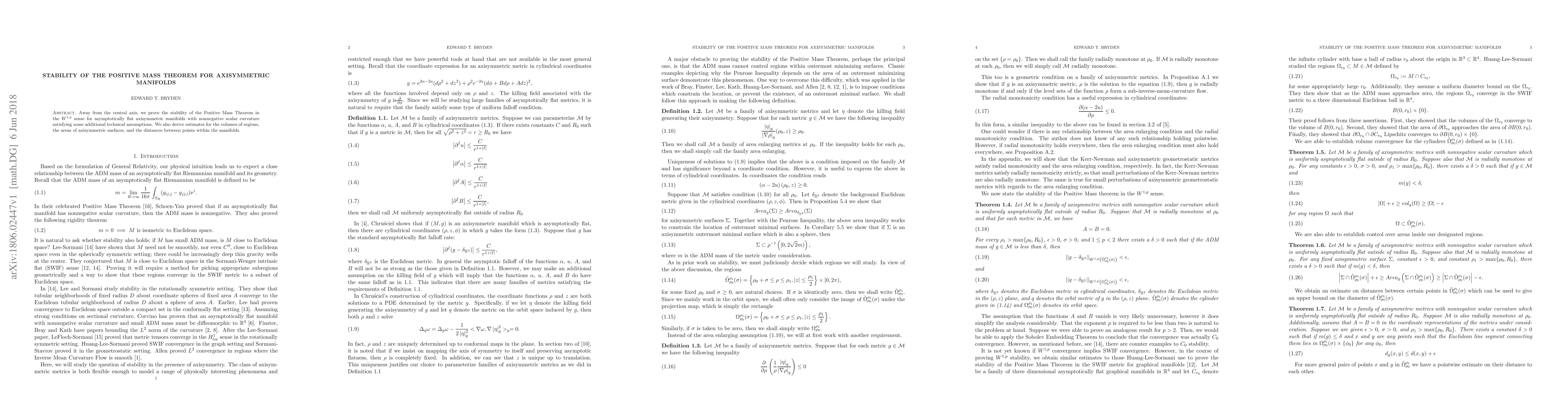 This paper proves the stability of the Positive Mass Theorem in the $W^{1,p}$ sense for asymptotically flat axisymmetric manifolds with nonnegative scalar curvature, away from the central axis. It also provides estimates for volumes, surface areas, and distances within these manifolds.