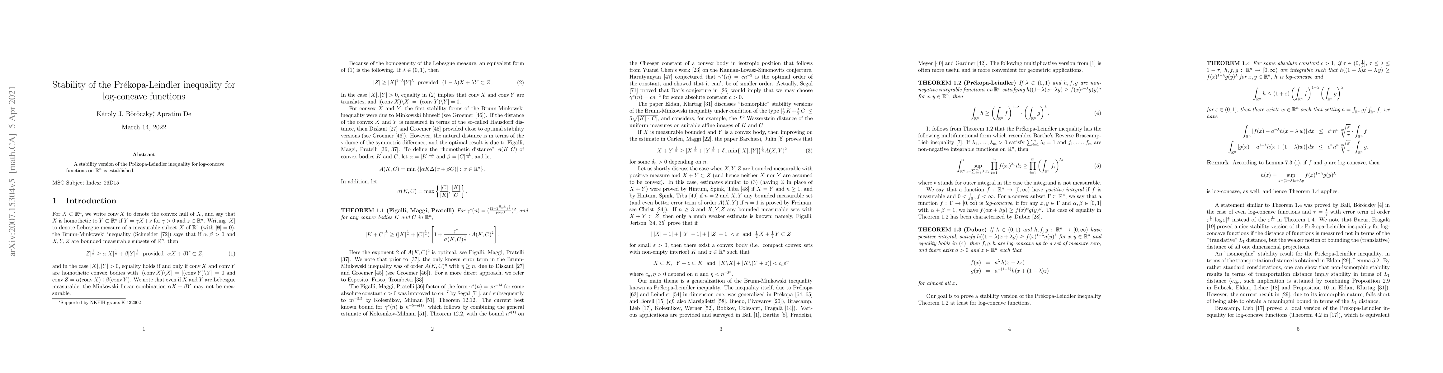 Summary: This paper establishes a stability version of the Prekopa-Leindler inequality for log-concave functions in n-dimensional Euclidean space, providing a quantitative measure of how the inequality holds under perturbations.