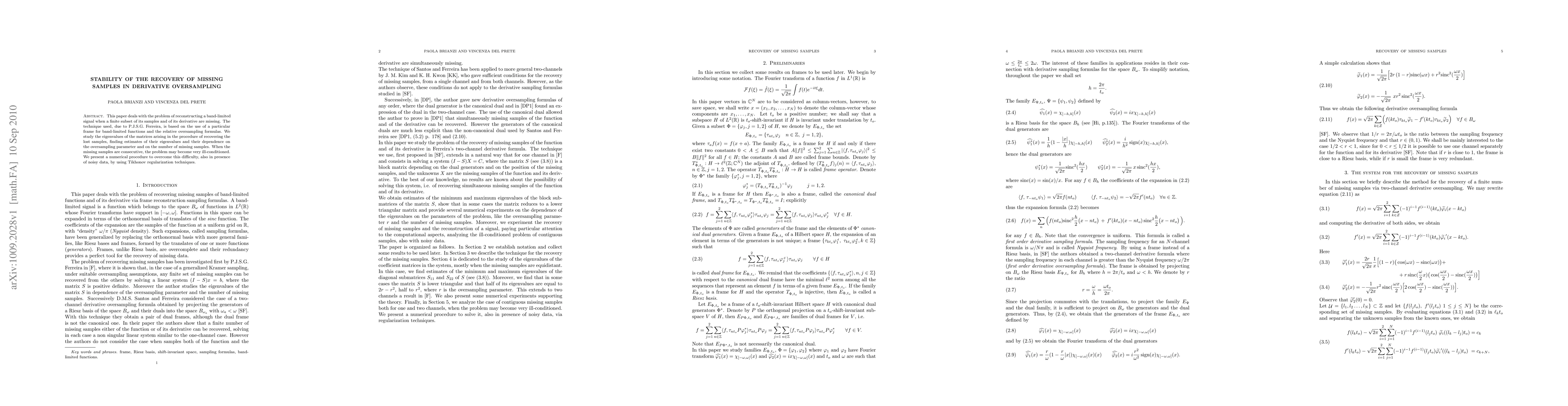 This paper deals with the problem of reconstructing a band-limited signal when a finite subset of its samples and of its derivative are missing. The technique used, due to P.J.S.G. Ferreira, is based on the use of a particular frame for band-limited functions and the relative oversampling formulas. We study the eigenvalues of the matrices arising in the procedure of recovering the lost samples, finding estimates of their eigenvalues and their dependence on the oversampling parameter and on the number of missing samples. When the missing samples are consecutive, the problem may become very ill-conditioned. We present a numerical procedure to overcome this difficulty, also in presence of noisy data, by using Tikhonov regularization techniques.