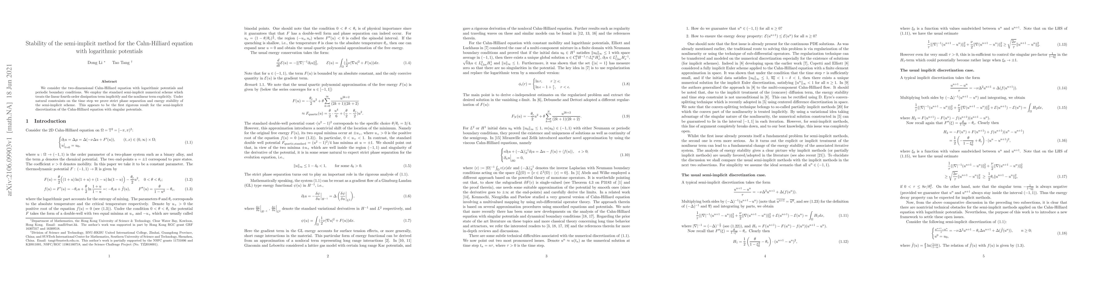 This paper proves strict phase separation and energy stability for the semi-implicit method applied to the two-dimensional Cahn-Hilliard equation with logarithmic potentials, establishing the first rigorous result for such singular potentials under appropriate time step constraints.