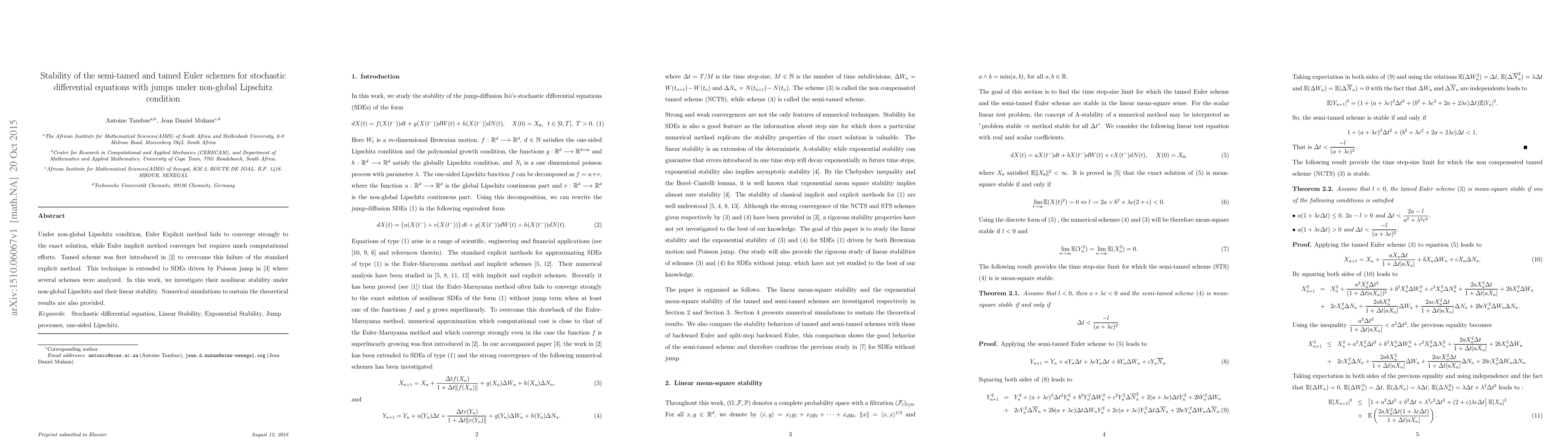 Under non-global Lipschitz condition, Euler Explicit method fails to converge strongly to the exact solution, while Euler implicit method converges but requires much computational efforts. Tamed scheme was first introduced in [2] to overcome this failure of the standard explicit method. This technique is extended to SDEs driven by Poisson jump in [3] where several schemes were analyzed. In this work, we investigate their nonlinear stability under non-global Lipschitz and their linear stability. Numerical simulations to sustain the theoretical results are also provided.
