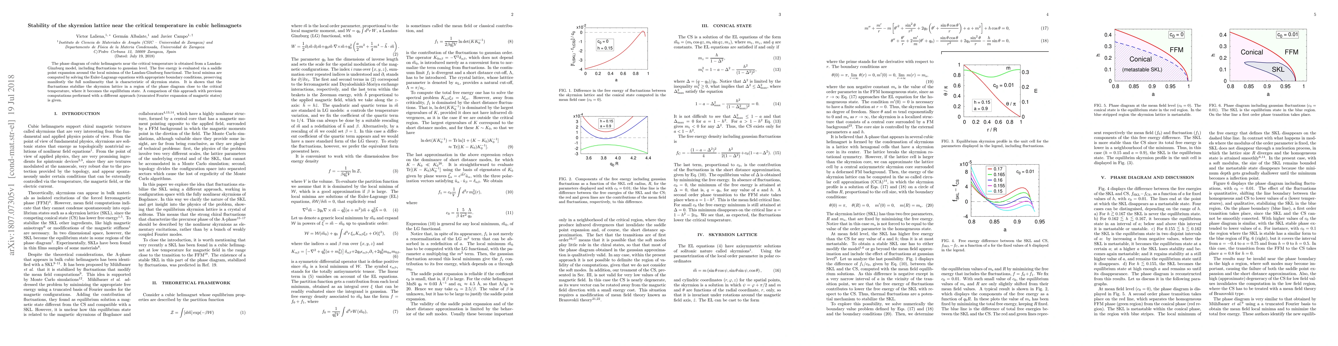 This paper investigates the stability of skyrmion lattices in cubic helimagnets near the critical temperature using a Landau-Ginzburg model, revealing that fluctuations stabilize the skyrmion lattice in this region, contrasting with previous results from a truncated Fourier expansion. The study employs a saddle point expansion and solves Euler-Lagrange equations to capture the full nonlinearity of skyrmion states.