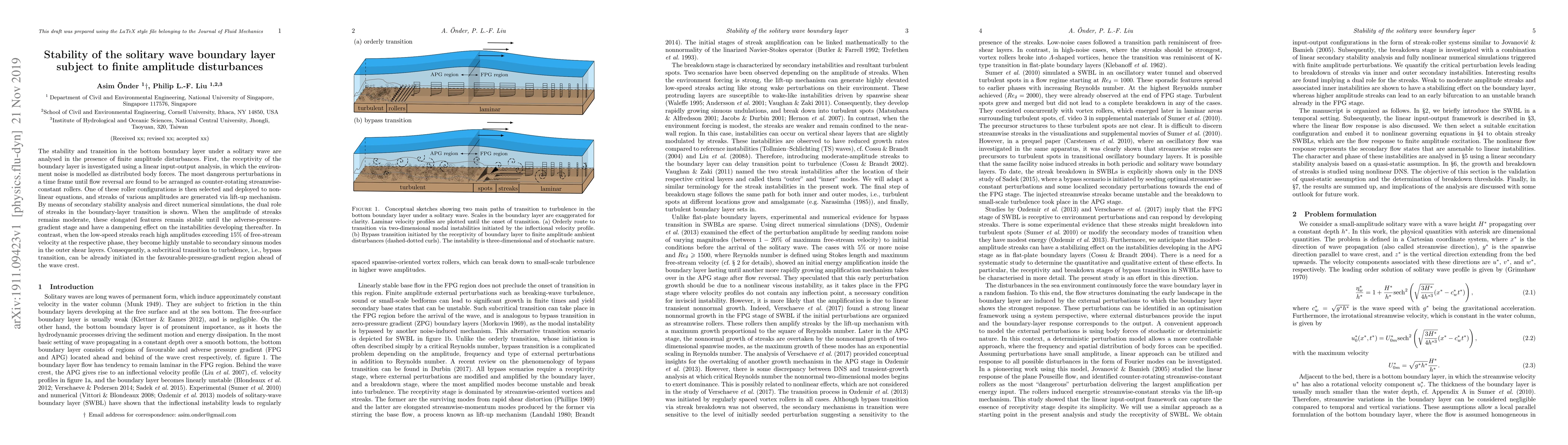 This paper investigates the stability of a solitary wave boundary layer under finite amplitude disturbances, revealing that moderate-amplitude streaks stabilize the flow, while high-amplitude streaks trigger secondary instabilities leading to early turbulence transition.