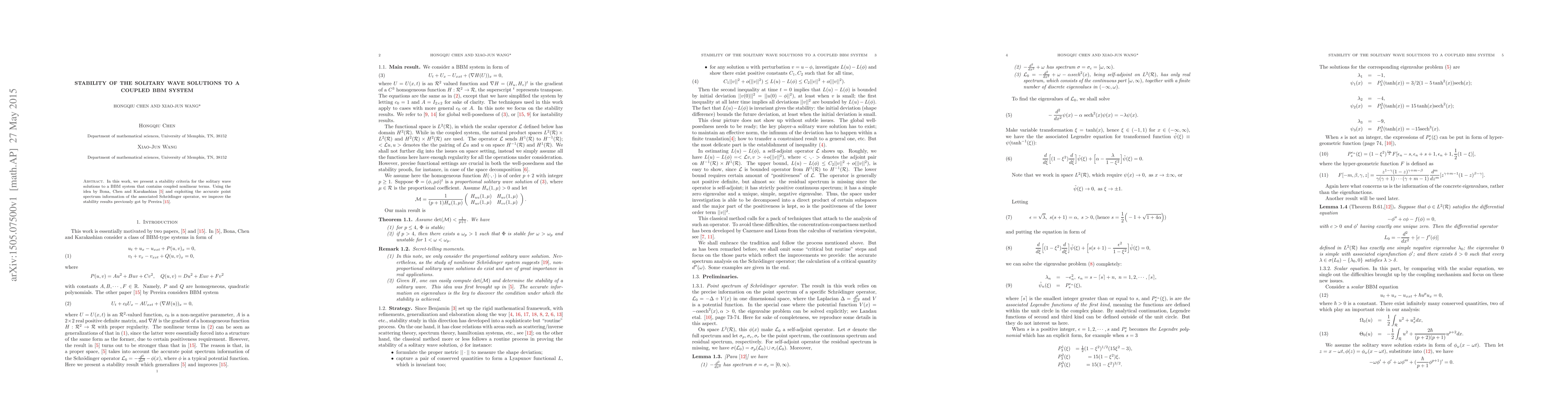 This paper establishes a stability criteria for solitary wave solutions in a coupled BBM system with nonlinear terms, enhancing previous results by leveraging detailed spectral information from the associated Schrödinger operator.