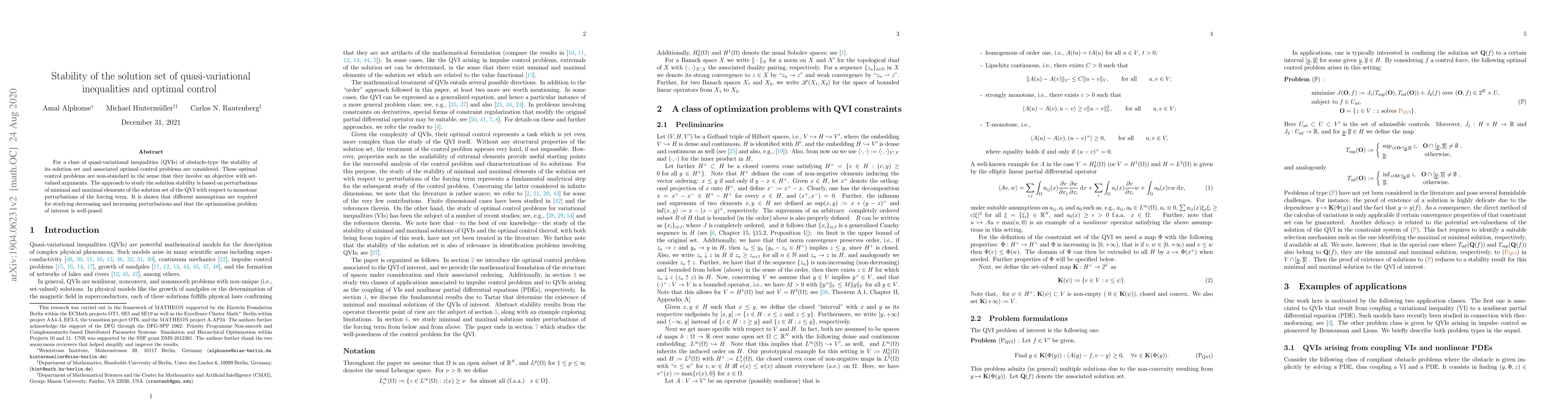 This paper investigates the stability of solution sets for quasi-variational inequalities (QVIs) and associated optimal control problems involving set-valued arguments. It demonstrates that distinct assumptions are necessary for decreasing versus increasing perturbations, ensuring the well-posedness of the optimization problem.