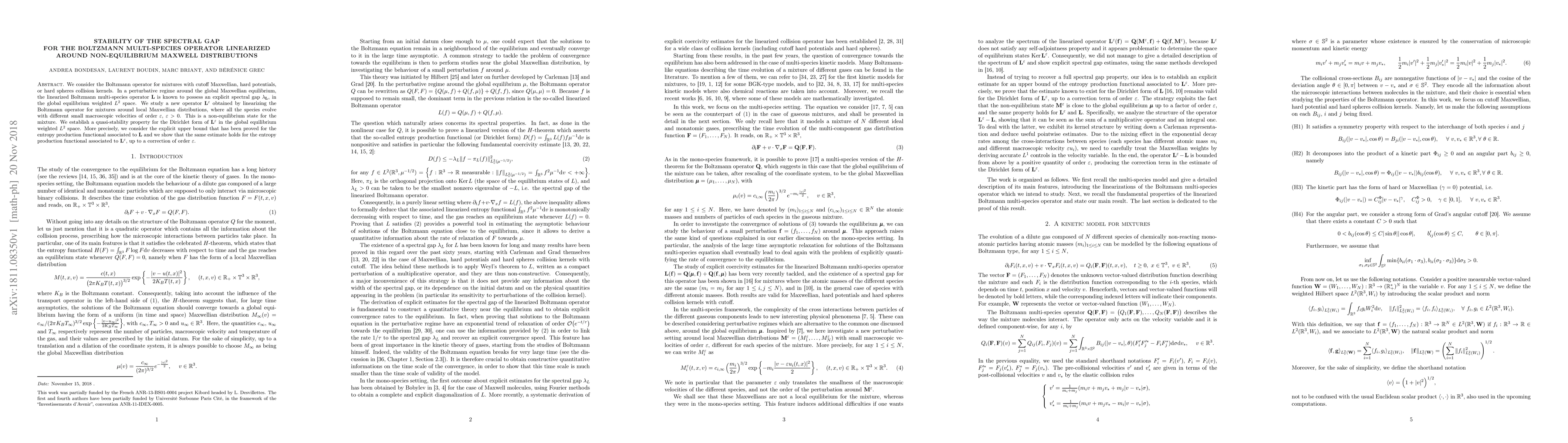 We consider the Boltzmann operator for mixtures with cutoff Maxwellian, hard potentials, or hard spheres collision kernels. In a perturbative regime around the global Maxwellian equilibrium, the linearized Boltzmann multi-species operator $\mathbf{L}$ is known to possess an explicit spectral gap $\lambda_{\mathbf{L}}$, in the global equilibrium weighted $L^2$ space. We study a new operator $\mathbf{L^\varepsilon}$ obtained by linearizing the Boltzmann operator for mixtures around local Maxwellian distributions, where all the species evolve with different small macroscopic velocities of order $\varepsilon$, $\varepsilon >0$. This is a non-equilibrium state for the mixture. We establish a quasi-stability property for the Dirichlet form of $\mathbf{L^\varepsilon}$ in the global equilibrium weighted $L^2$ space. More precisely, we consider the explicit upper bound that has been proved for the entropy production functional associated to $\mathbf{L}$ and we show that the same estimate holds for the entropy production functional associated to $\mathbf{L^\varepsilon}$, up to a correction of order $\varepsilon$.