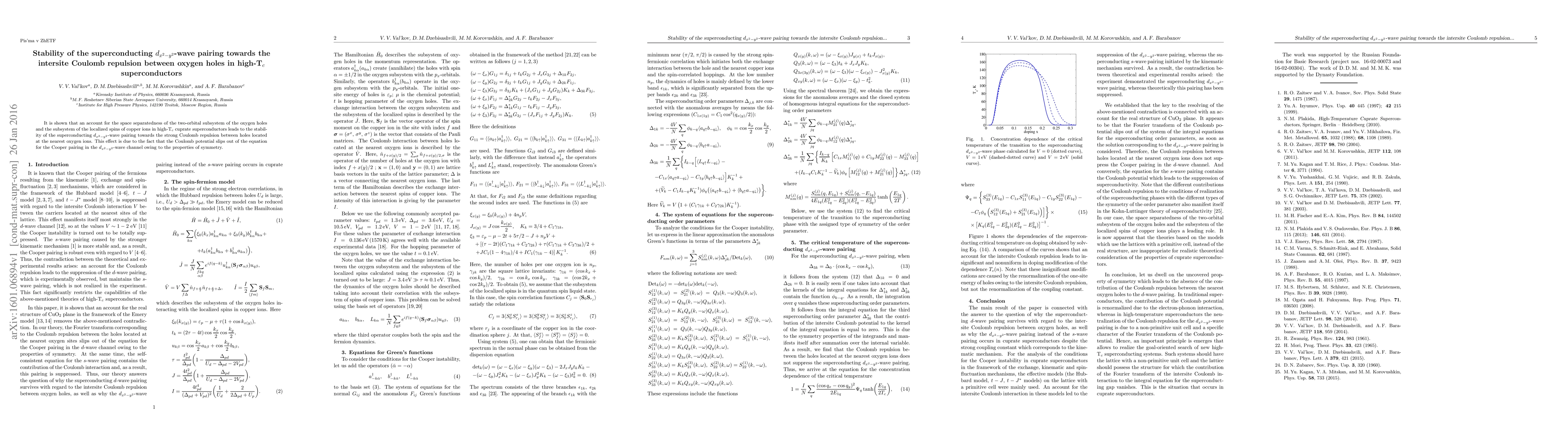 It is shown that an account for the space separatedness of the two-orbital subsystem of the oxygen holes and the subsystem of the localized spins of copper ions in high-T$_c$ cuprate superconductors leads to the stability of the superconducting $d_{x^2-y^2}$-wave pairing towards the strong Coulomb repulsion between holes located at the nearest oxygen ions. This effect is due to the fact that the Coulomb potential slips out of the equation for the Cooper pairing in the $d_{x^2-y^2}$-wave channel owing to the properties of symmetry.