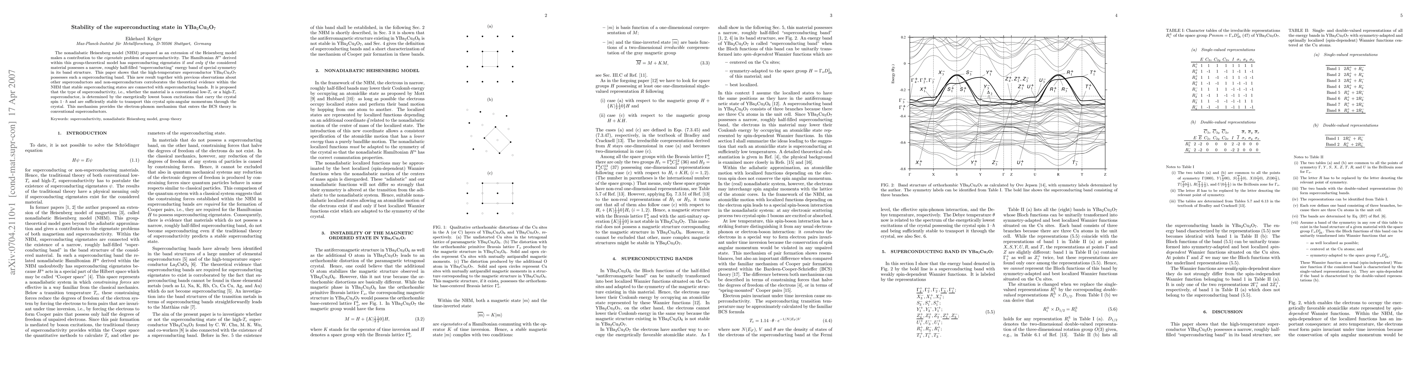 The nonadiabatic Heisenberg model (NHM) proposed as an extension of the Heisenberg model makes a contribution to the eigenstate problem of superconductivity. The Hamiltonian H^n derived within this group-theoretical model has superconducting eigenstates if and only if the considered material possesses a narrow, roughly half-filled "superconducting" energy band of special symmetry in its band structure. This paper shows that the high-temperature superconductor YBa_2Cu_3O_7 possesses such a superconducting band. This new result together with previous observations about other superconductors and non-superconductors corroborates the theoretical evidence within the NHM that stable superconducting states are connected with superconducting bands. It is proposed that the type of superconductivity, i.e., whether the material is a conventional low-T_c or a high-T_c superconductor, is determined by the energetically lowest boson excitations that carry the crystal spin 1*hbar and are sufficiently stable to transport this crystal spin-angular momentum through the crystal. This mechanism provides the electron-phonon mechanism that enters the BCS theory in conventional superconductors.