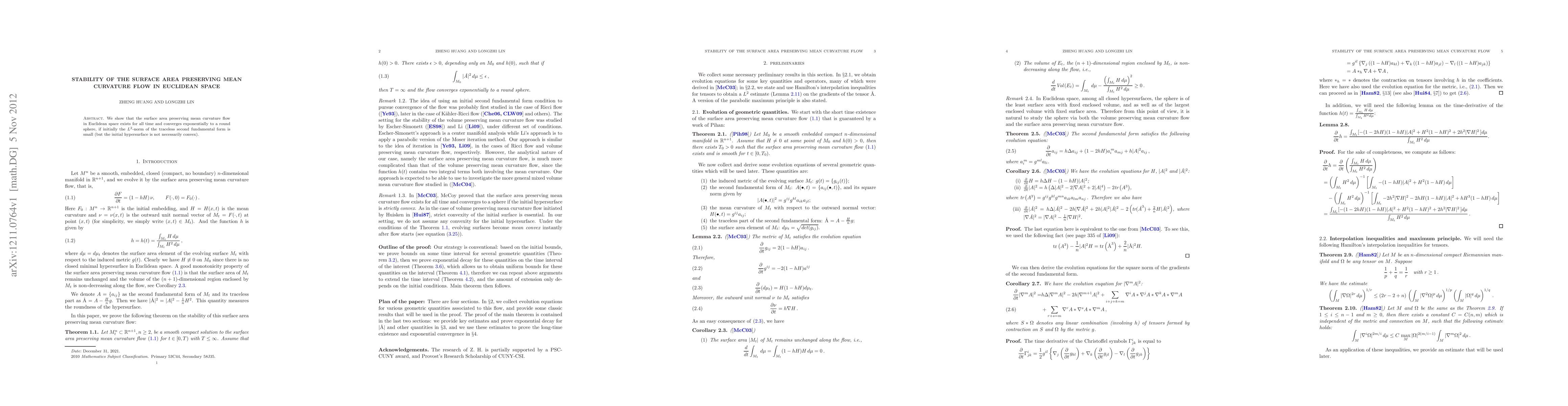 Summary: The research demonstrates that surface area preserving mean curvature flow in Euclidean space persists indefinitely and converges rapidly to a round sphere when the initial L^2-norm of the traceless second fundamental form is small, regardless of the initial hypersurface's convexity.