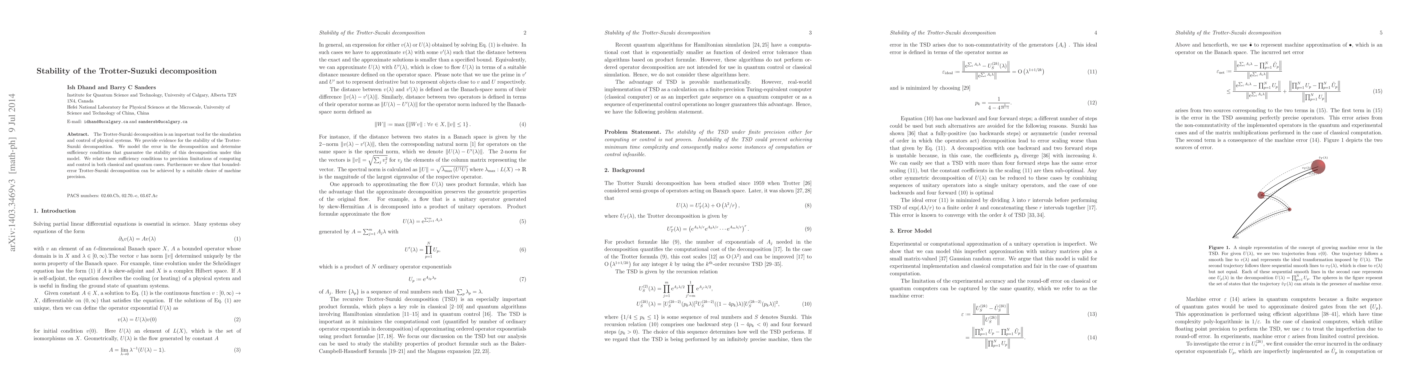 The Trotter-Suzuki decomposition is crucial for simulating physical systems, and this paper demonstrates its stability under specific error conditions. It establishes sufficiency criteria for stability and links these to precision limitations in both classical and quantum computing.
