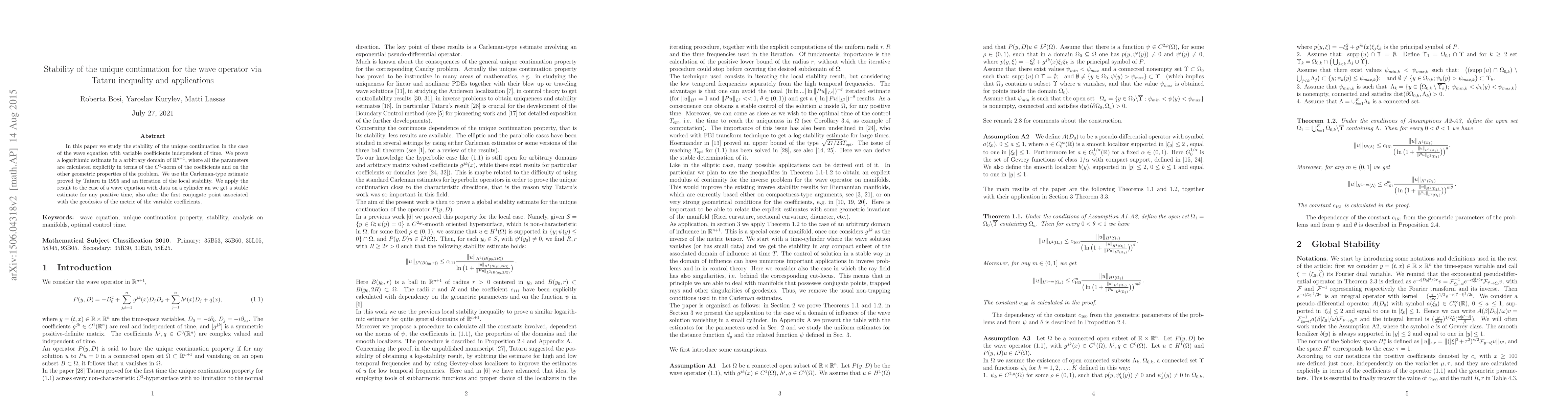 In this paper we study the stability of the unique continuation in the case of the wave equation with variable coefficients independent of time. We prove a logarithmic estimate in a arbitrary domain of ${\mathbb R}^{n+1}$, where all the parameters are calculated explicitly in terms of the $C^1$-norm of the coefficients and on the other geometric properties of the problem. We use the Carleman-type estimate proved by Tataru in 1995 and an iteration for locals stability. We apply the result to the case of a wave equation with data on a cylinder an we get a stable estimate for any positive time, also after the first conjugate point for the geodesics of the metric related to the variable coefficients.