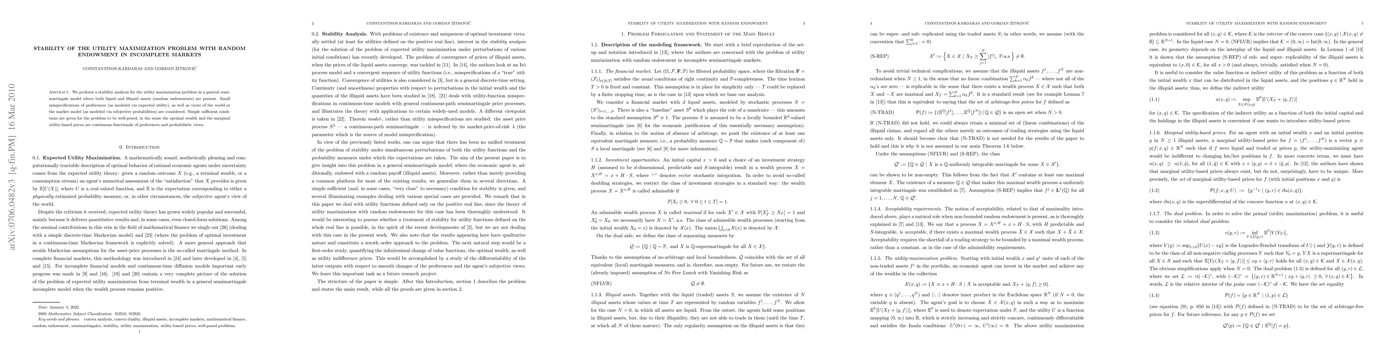 This paper analyzes the stability of utility maximization in incomplete markets with random endowments, providing sufficient conditions for the problem to remain well-posed under small misspecifications in preferences and market models. It ensures continuity of optimal wealth and marginal utility-based prices with respect to changes in preferences and probabilistic views.