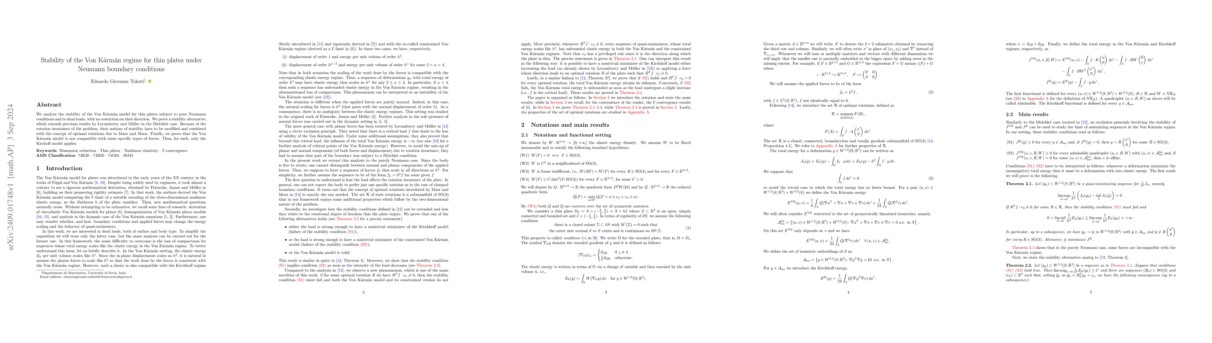 The paper investigates the stability of the Von Kármán model for thin plates under Neumann boundary conditions and dead loads, extending stability results for the Dirichlet case. It combines modified notions of stability with optimal rotations, showing the Von Kármán model's incompatibility with certain forces, where the Kirchoff model is more applicable.