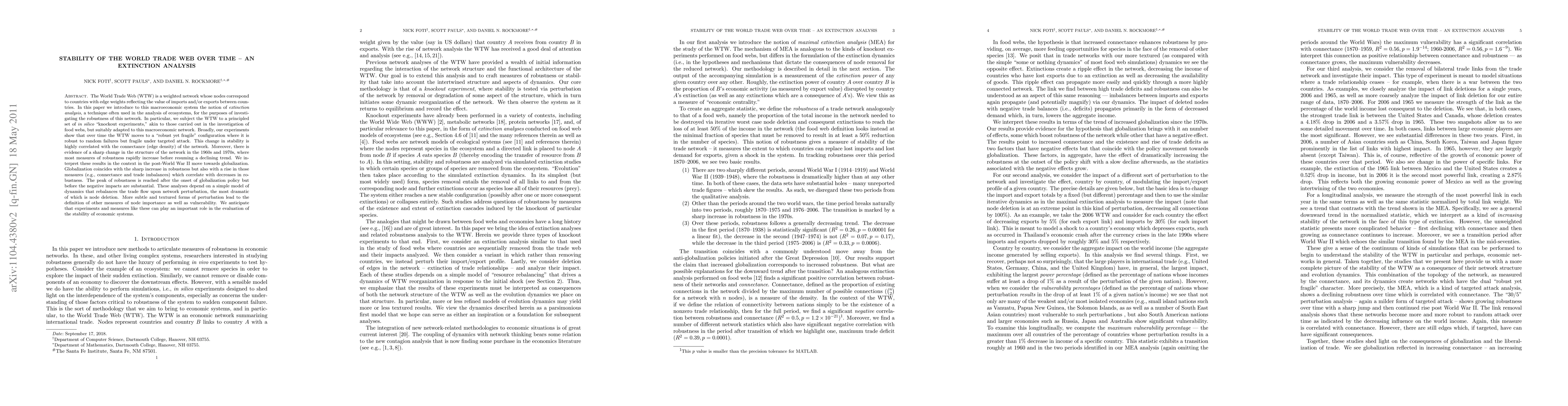 The World Trade Web (WTW) is a weighted network whose nodes correspond to countries with edge weights reflecting the value of imports and/or exports between countries. In this paper we introduce to this macroeconomic system the notion of extinction analysis, a technique often used in the analysis of ecosystems, for the purposes of investigating the robustness of this network. In particular, we subject the WTW to a principled set of in silico "knockout experiments," akin to those carried out in the investigation of food webs, but suitably adapted to this macroeconomic network. Broadly, our experiments show that over time the WTW moves to a "robust yet fragile" configuration where it is robust to random failures but fragile under targeted attack. This change in stability is highly correlated with the connectance (edge density) of the network. Moreover, there is evidence of a sharp change in the structure of the network in the 1960s and 1970s, where most measures of robustness rapidly increase before resuming a declining trend. We interpret these results in the context in the post-World War II move towards globalization. Globalization coincides with the sharp increase in robustness but also with a rise in those measures (e.g., connectance and trade imbalances) which correlate with decreases in robustness. The peak of robustness is reached after the onset of globalization policy but before the negative impacts are substantial. These analyses depend on a simple model of dynamics that rebalances the trade flow upon network perturbation, the most dramatic of which is node deletion. More subtle and textured forms of perturbation lead to the definition of other measures of node importance as well as vulnerability. We anticipate that experiments and measures like these can play an important role in the evaluation of the stability of economic systems.