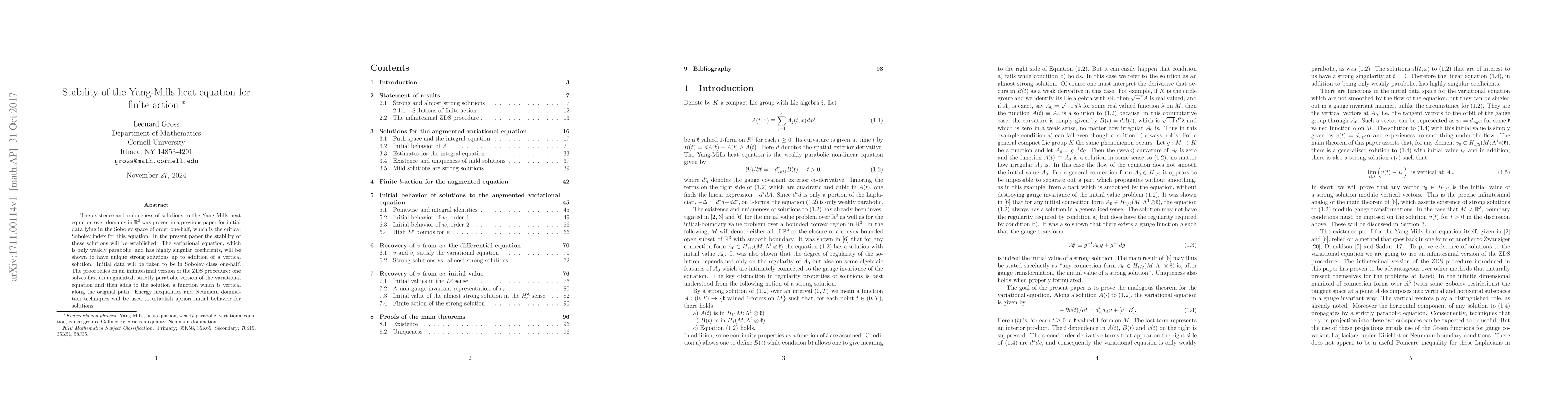 This paper establishes the stability of solutions to the Yang-Mills heat equation in Euclidean three-space, proving unique strong solutions up to vertical additions. The proof utilizes an infinitesimal version of the ZDS procedure, energy inequalities, and Neumann domination techniques for initial data in the critical Sobolev space.
