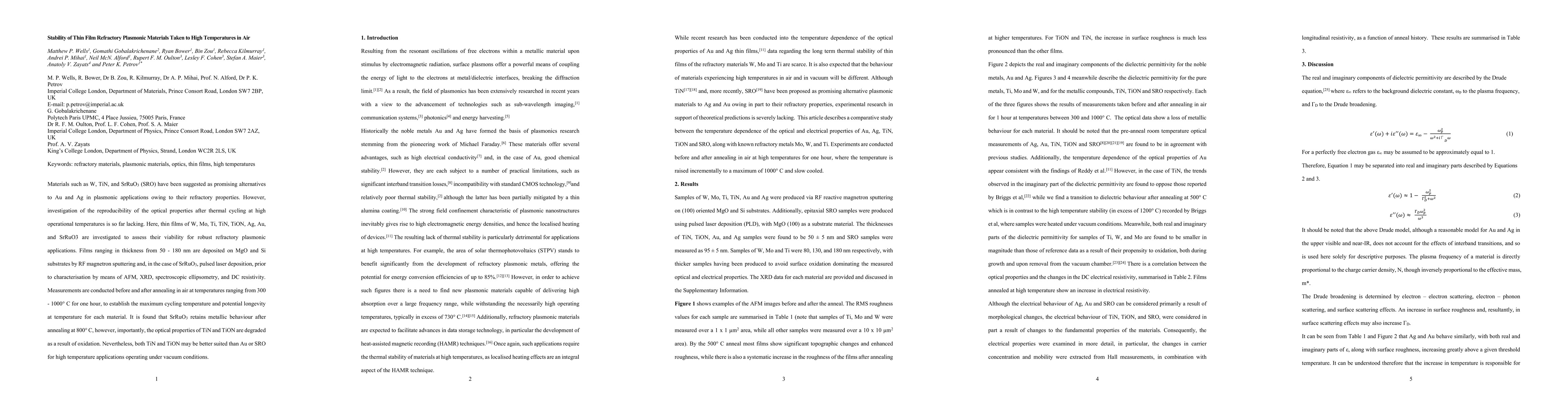 This study investigates the stability of thin film refractory plasmonic materials like W, TiN, and SrRuO3 when subjected to high temperatures in air. The results show that SrRuO3 maintains metallic properties up to 800°C, while TiN and TiON degrade due to oxidation, suggesting they may be more suitable for vacuum high-temperature applications than Au or SrRuO3.