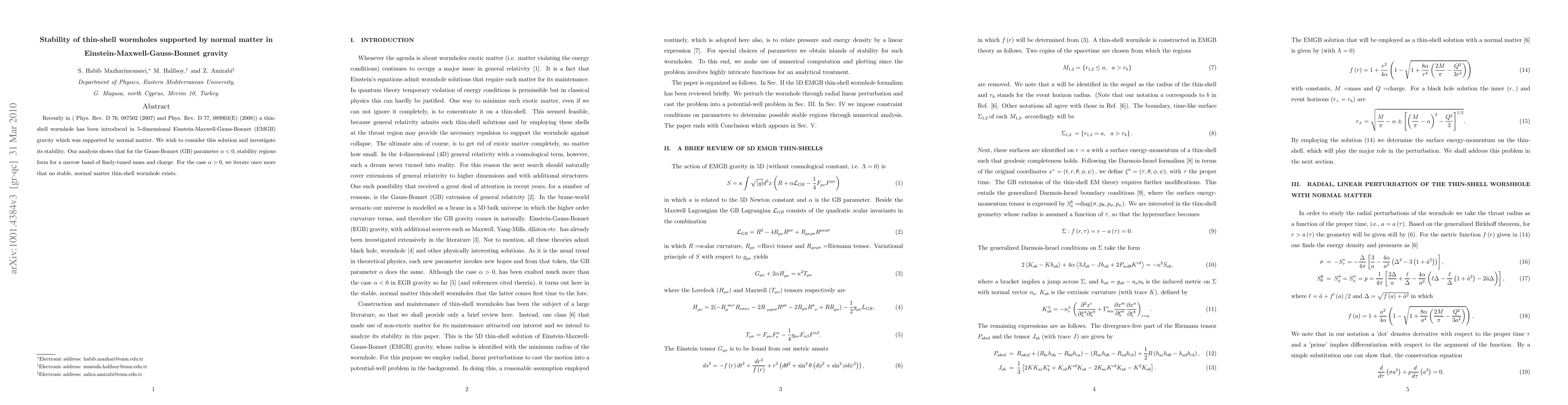 Recently in (Phys. Rev. D 76, 087502 (2007) and Phys. Rev. D 77, 089903(E) (2008)) a thin-shell wormhole has been introduced in 5-dimensional Einstein-Maxwell-Gauss-Bonnet (EMGB) gravity which was supported by normal matter. We wish to consider this solution and investigate its stability. Our analysis shows that for the Gauss-Bonnet (GB) parameter $\alpha <0,$ stability regions form for a narrow band of finely-tuned mass and charge. For the case $\alpha >0$, we iterate once more that no stable, normal matter thin-shell wormhole exists.