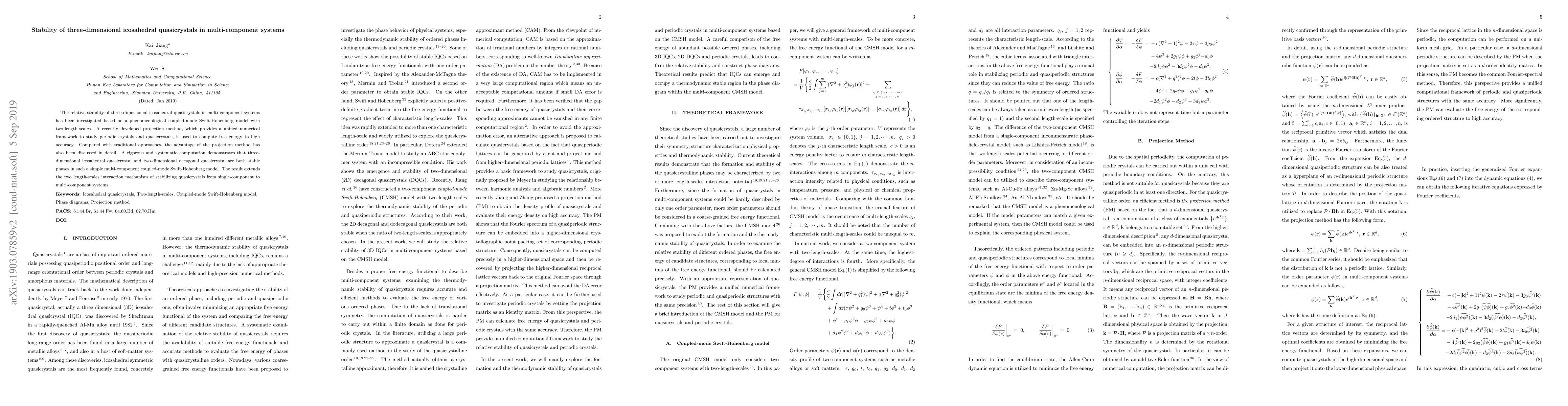 This paper investigates the stability of three-dimensional icosahedral quasicrystals in multi-component systems using a coupled-mode Swift-Hohenberg model and a projection method. The study finds that these quasicrystals, along with two-dimensional decagonal quasicrystals, are stable phases, extending the stabilization mechanism to multi-component systems.