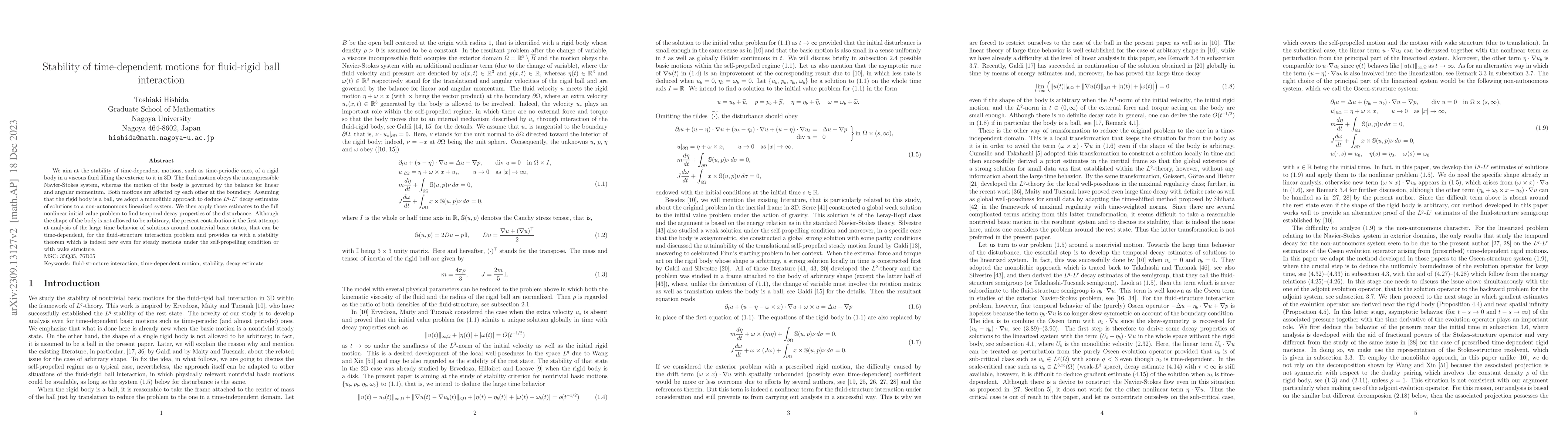 We aim at the stability of time-dependent motions, such as time-periodic ones, of a rigid body in a viscous fluid filling the exterior to it in 3D. The fluid motion obeys the incompressible Navier-Stokes system, whereas the motion of the body is governed by the balance for linear and angular momentum. Both motions are affected by each other at the boundary. Assuming that the rigid body is a ball, we adopt a monolithic approach to deduce $L^q$-$L^r$ decay estimates of solutions to a non-autonomous linearized system. We then apply those estimates to the full nonlinear initial value problem to find temporal decay properties of the disturbance. Although the shape of the body is not allowed to be arbitrary, the present contribution is the first attempt at analysis of the large time behavior of solutions around nontrivial basic states, that can be time-dependent, for the fluid-structure interaction problem and provides us with a stability theorem which is indeed new even for steady motions under the self-propelling condition or with wake structure.
