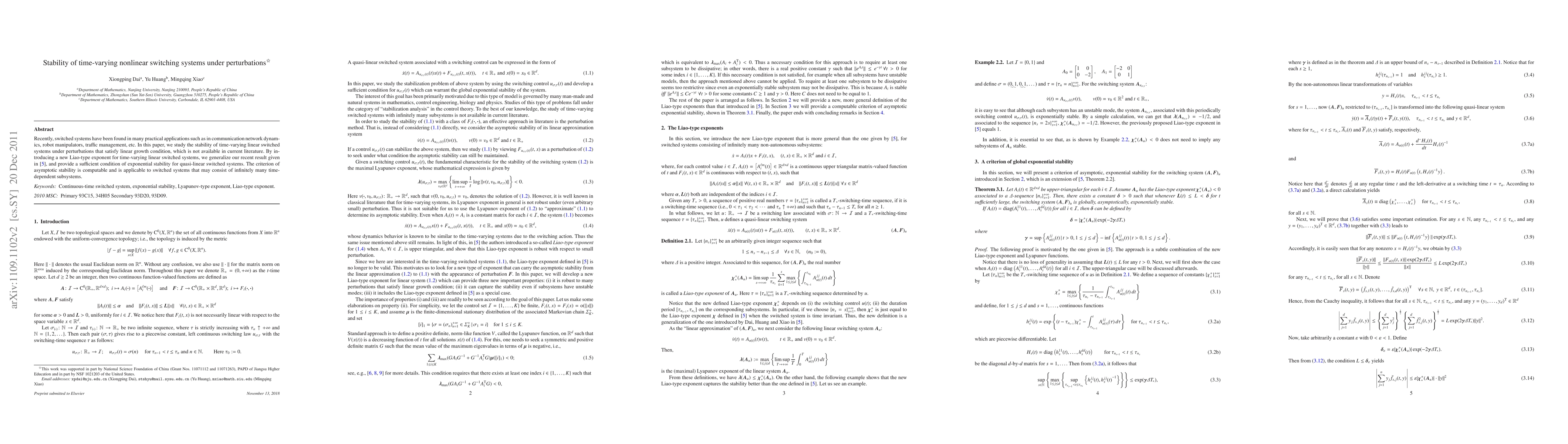 Summary: This paper investigates the stability of time-varying nonlinear switching systems using a Liao-type exponent method, focusing on how perturbations affect system stability. The study provides insights into maintaining system stability under varying conditions.