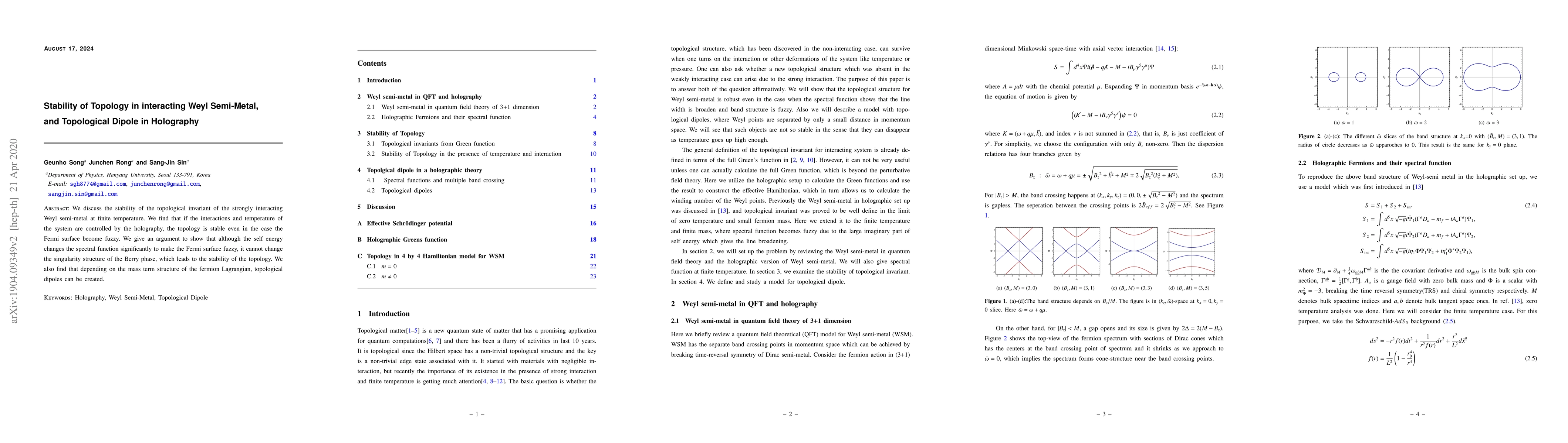 We discuss the stability of the topological invariant of the strongly interacting Weyl semi-metal at finite temperature. We find that if the interactions and temperature of the system are controlled by the holography, the topology is stable even in the case the Fermi surface become fuzzy. We give an argument to show that although the self energy changes the spectral function significantly to make the Fermi surface fuzzy, it cannot change the singularity structure of the Berry phase, which leads to the stability of the topology. We also find that depending on the mass term structure of the fermion Lagrangian, topological dipoles can be created.