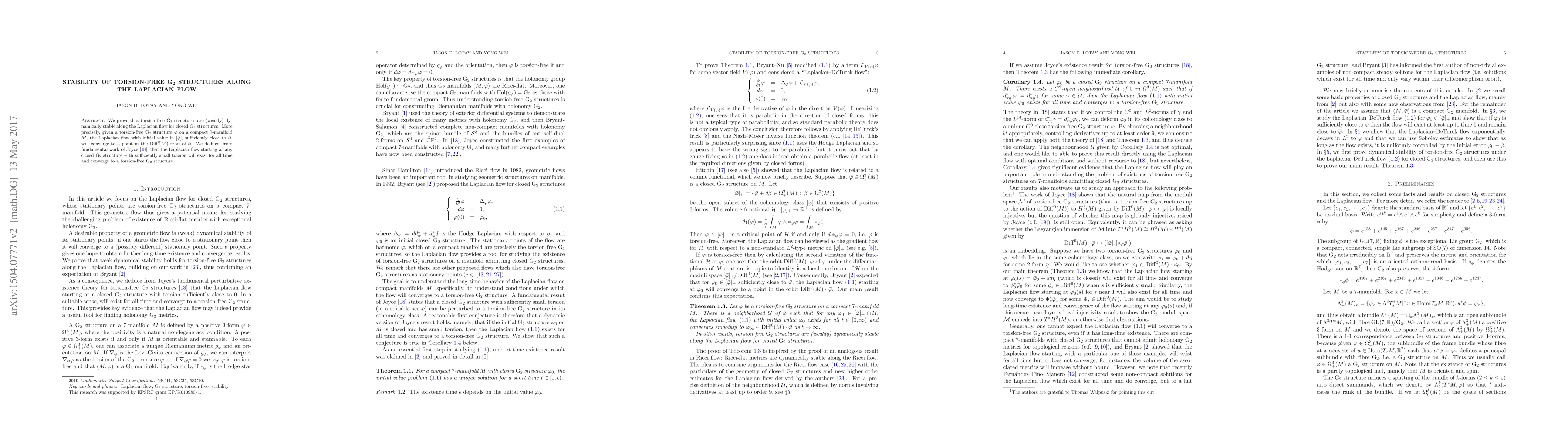 This paper proves the dynamic stability of torsion-free G_2 structures under the Laplacian flow for closed G_2 structures. Specifically, it shows that any sufficiently close initial torsion-free G_2 structure will converge to another torsion-free G_2 structure in the same diffeomorphism orbit.