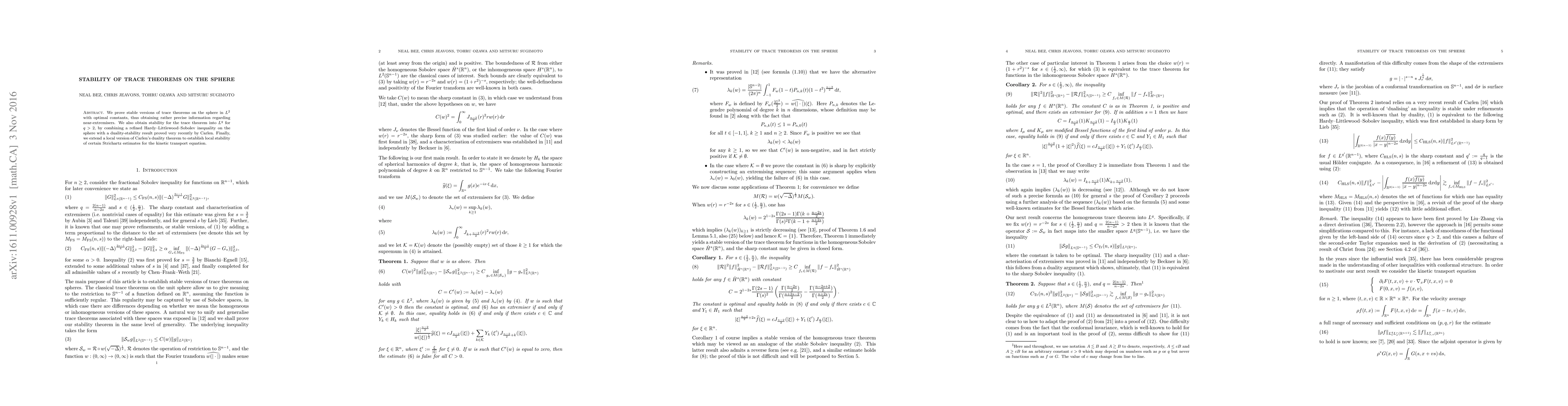 We prove stable versions of trace theorems on the sphere in $L^2$ with optimal constants, thus obtaining rather precise information regarding near-extremisers. We also obtain stability for the trace theorem into $L^q$ for $q > 2$, by combining a refined Hardy-Littlewood-Sobolev inequality on the sphere with a duality-stability result proved very recently by Carlen. Finally, we extend a local version of Carlen's duality theorem to establish local stability of certain Strichartz estimates for the kinetic transport equation.