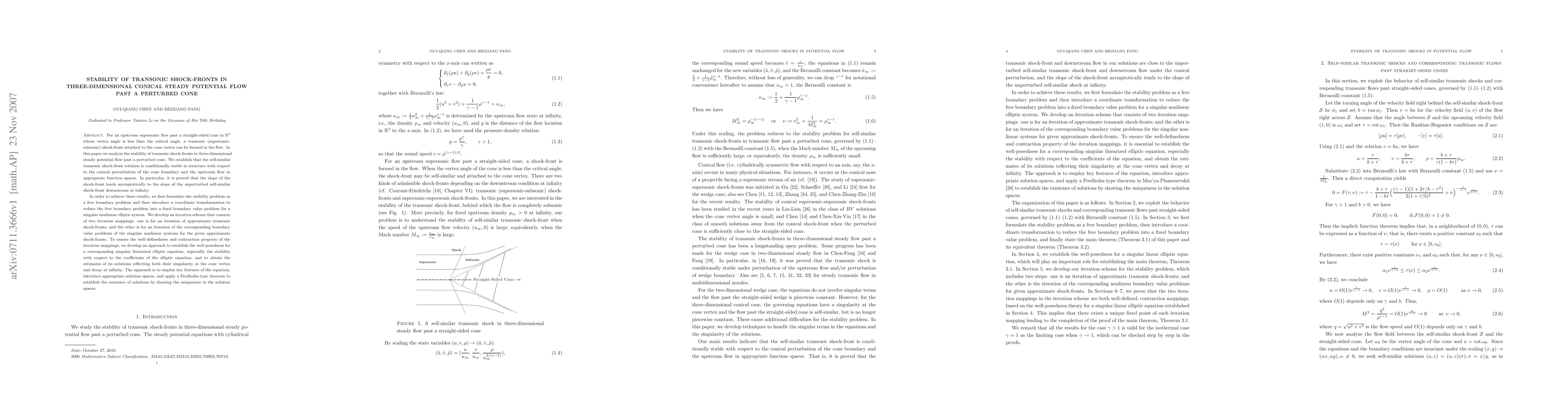 This paper investigates the stability of transonic shock-fronts in three-dimensional steady potential flow around a perturbed cone. It concludes that the self-similar shock-front solution is conditionally stable concerning cone boundary perturbations and upstream flow, with the shock-front slope asymptotically matching the unperturbed shock-front downstream.